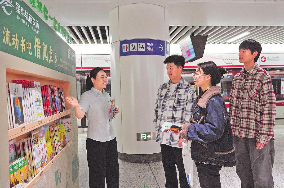 日前,浙江金华邮政与市轨道交通集团启用“流动书吧”,为建设“书香金华”又添一惠民实举。金华邮政为“流动书吧”免费提供近2000本杂志,乘客可在进站乘车时顺手借一本,出站时归还至固定还书点即可,契合当今人们碎片化的阅读习惯,受到乘客的欢迎。□刘越 摄影报道
