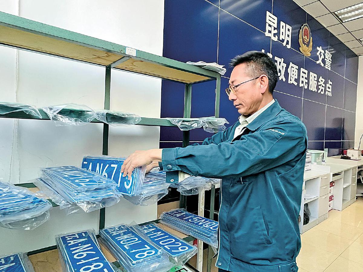 云南省邮政分公司近年来不断探索创新政务服务之道,与交警部门合作制定规范服务标准,构建“1个平台+10个标准化模板”“平台+网点”“前店后场”三位一体的服务模式,为群众提供多维“一站式”精准服务,实现各项业务办理“最多跑一次”,以高质量的交管便民服务打造新政务服务生态圈,让群众切实感受到改革带来的便利。目前,云南邮政警邮项目业务规模稳居全国邮政前列。图为警邮网点工作人员正在给客户寄递车牌。 □云南记者 杨晓颖 摄影报道