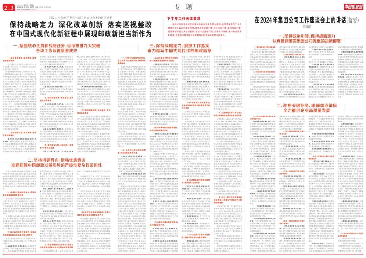 必须深入学习领会党的二十届三中全会精神,结合邮政实际认真抓好贯彻落实;必须自觉把改革摆在更加突出位置,通过全面深化改革激发企业发展动力;必须自觉把落实国有企业改革深化提升行动方案作为硬任务,通过全面深化改革不断做强做优;必须自觉把改革作为关键一招,着力推动各项重点改革取得新突破。