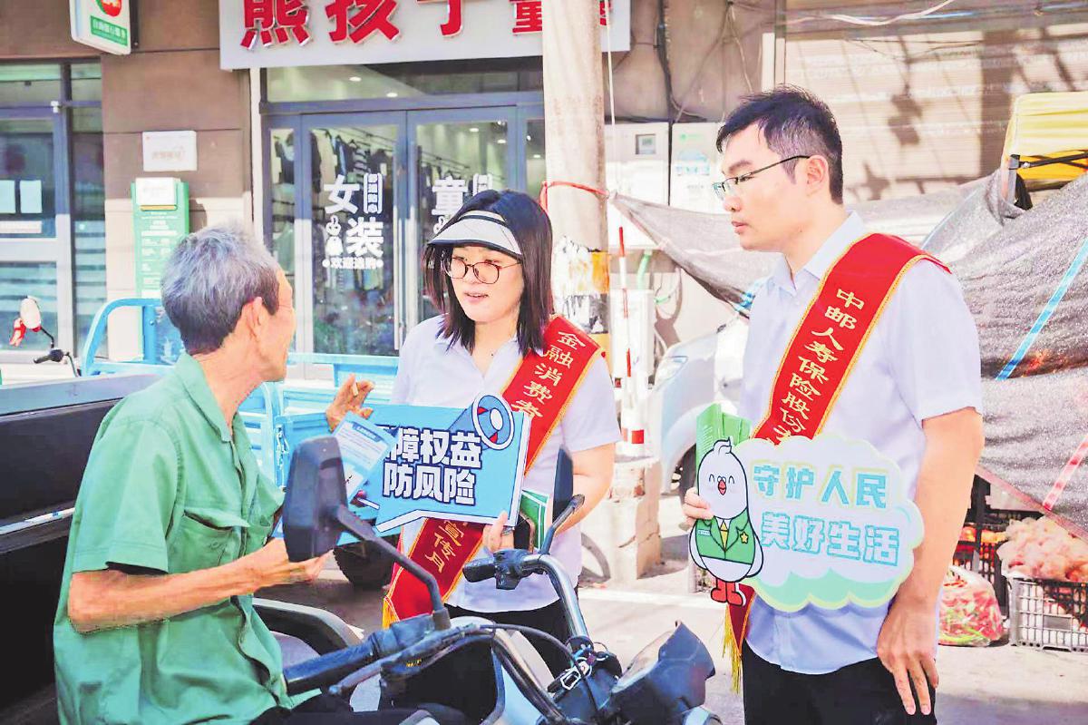 9月6日,中邮保险河南分公司消保宣传队走进新乡市原阳县的乡村集市、田间地头开展了一系列金融知识进乡村活动。图为该分公司工作人员借助乡村集市,通过发放宣传资料、现场互动讲解等方式,向村民宣传防骗知识与自我保护技能。 □王颜 摄影报道