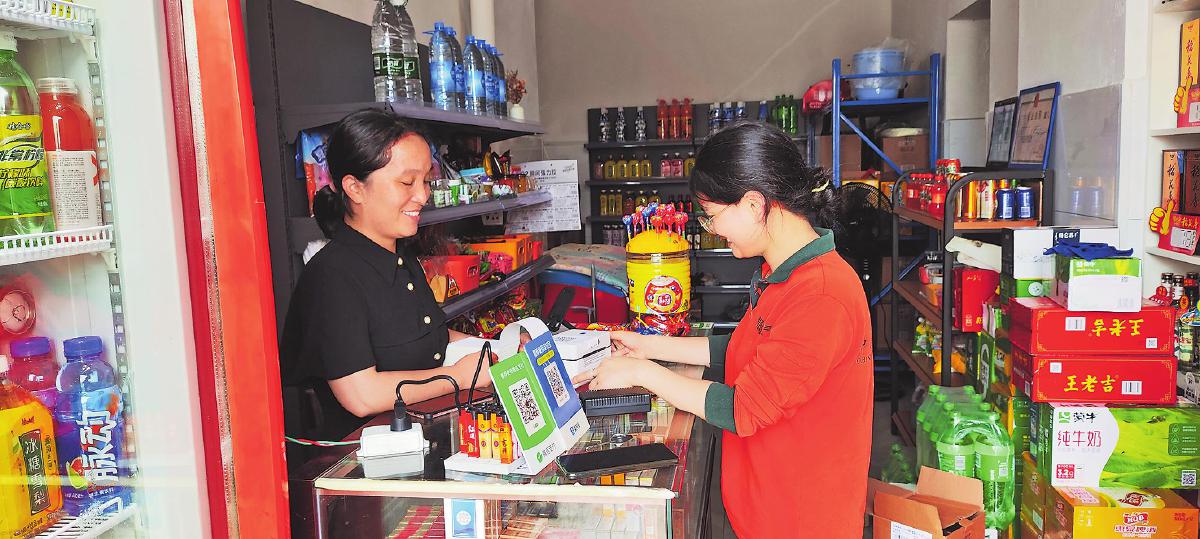 揽投员在居民小区便利店宣贯“寄件宝”扫码操作流程。 □黄舒颖 摄