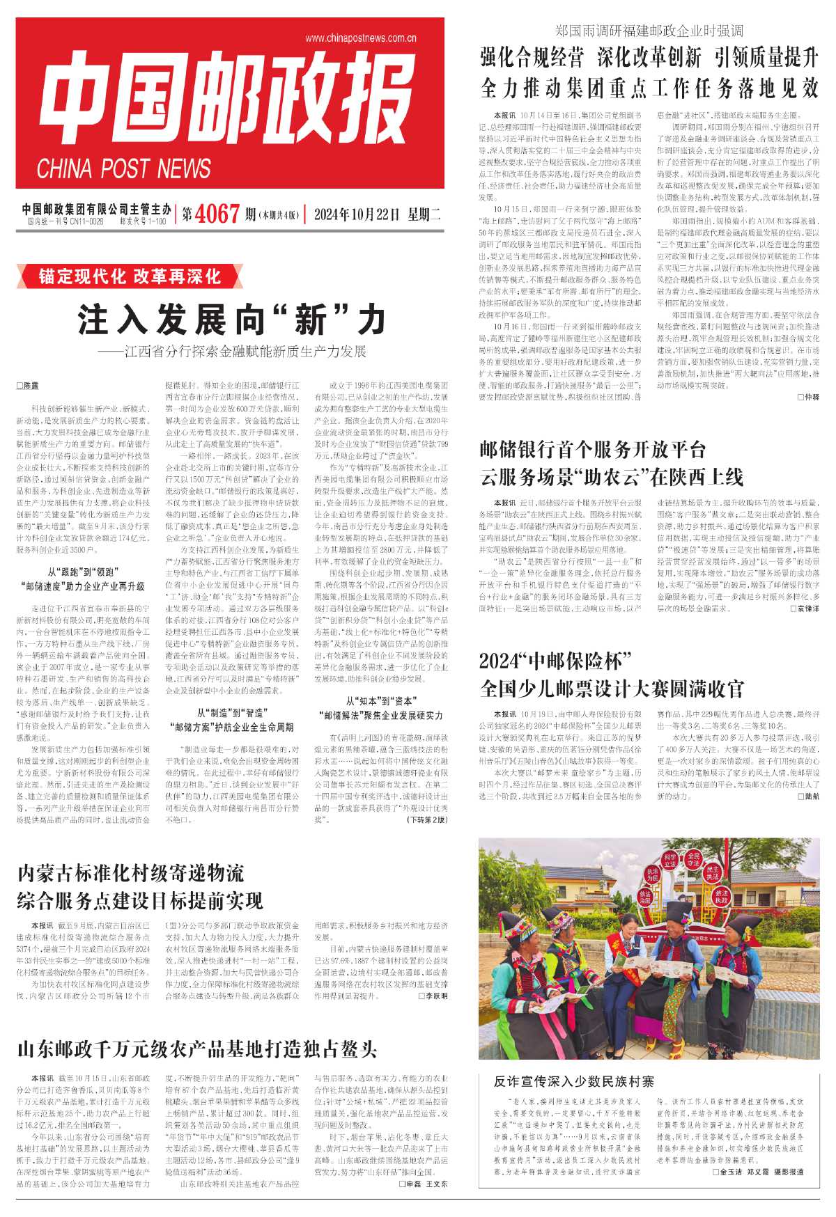 本报讯 10月19日,由中邮人寿保险股份有限公司独家冠名的2024“中邮保险杯”全国少儿邮票设计大赛颁奖典礼在北京举行。来自江苏的倪梦婕、安徽的吴语彤、重庆的伍茗钰分别凭借作品《徐州音乐厅》《五陵山春色》《山城故事》获得一等奖。
