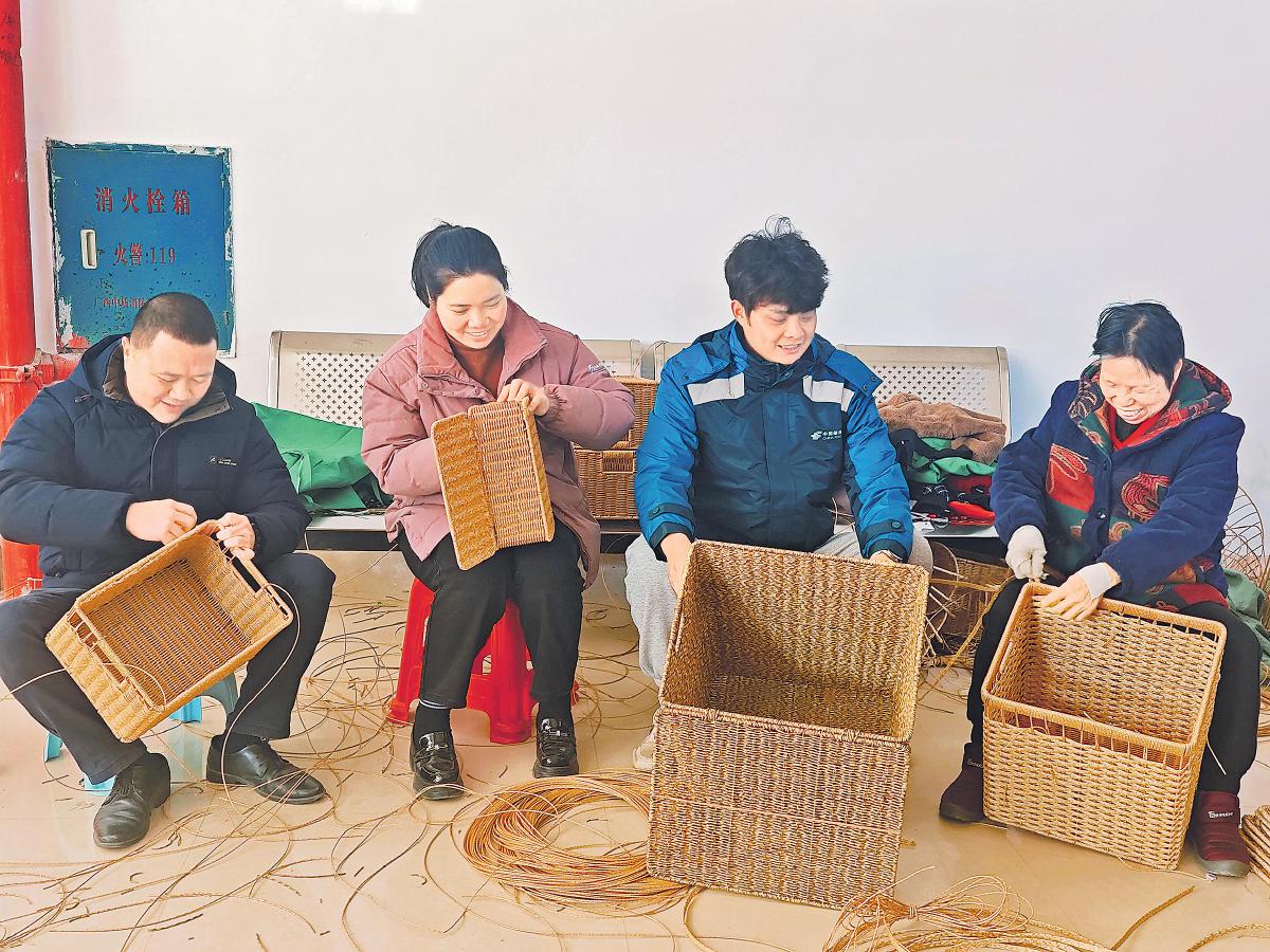 村民在浦北邮政乡村振兴示范基地内编织竹艺制品。 □吴永霞 摄
