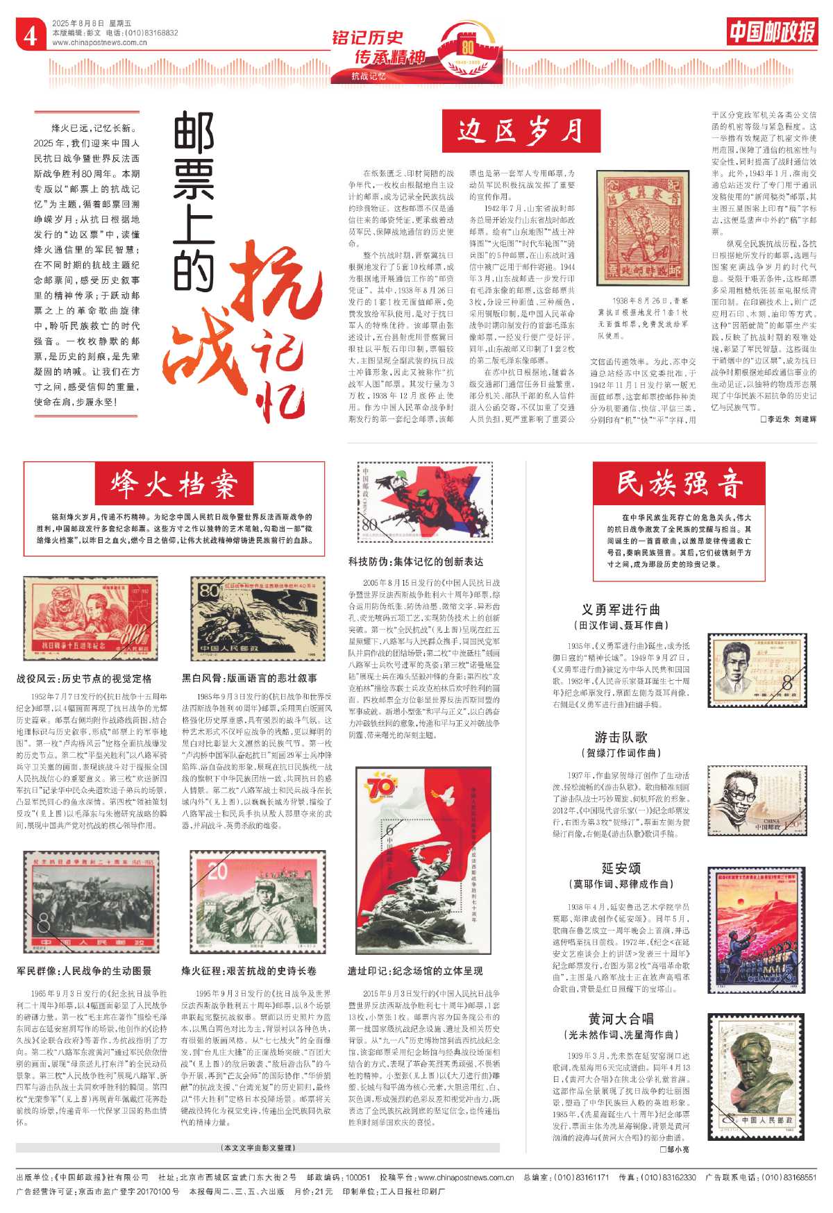 烽火已远,记忆长新。2025年,我们迎来中国人民抗日战争暨世界反法西斯战争胜利80周年。本期专版以“邮票上的抗战记忆”为主题,循着邮票回溯峥嵘岁月:从抗日根据地发行的“边区票”中,读懂烽火通信里的军民智慧;在不同时期的抗战主题纪念邮票间,感受历史叙事里的精神传承;于跃动邮票之上的革命歌曲旋律中,聆听民族救亡的时代强音。一枚枚静默的邮票,是历史的刻痕,是先辈凝固的呐喊。让我们在方寸之间,感受信仰的重量,使命在肩,步履永坚!