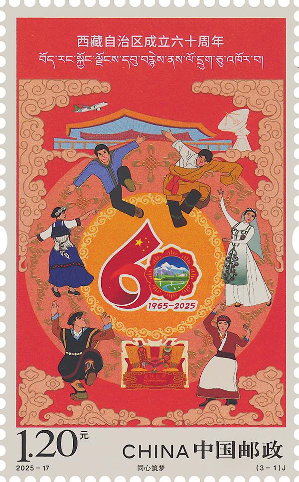 第一枚“同心筑梦”,画面以西藏自治区成立60周年庆祝活动徽标为主体,四周环绕身着盛装欢庆的各族人民,背景展现了拉萨机场、C919飞机、日喀则40米射电望远镜等元素,表现了西藏自治区成立60年来,各族人民在党的领导下携手共进、同心同行、民族团结进步的和谐画面。