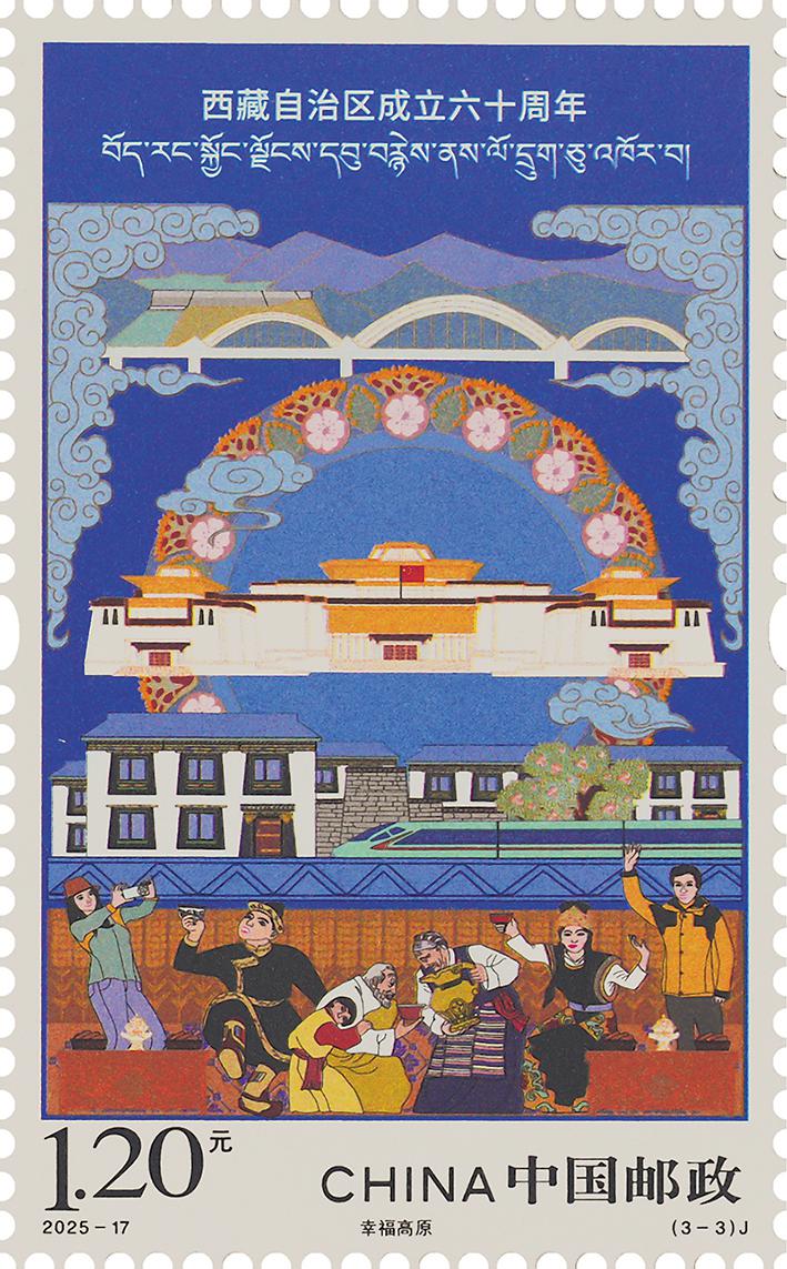 邮票图案融合藏派绘画的民族特色与现代装饰画的构成艺术语言,色彩绚丽、气势宏大、节奏明快,展现出在新时代党的治藏方略引领下,西藏各族人民携手共进、同心同行,各项事业取得全方位进步、历史性成就,各族群众获得感、幸福感、安全感不断提升。