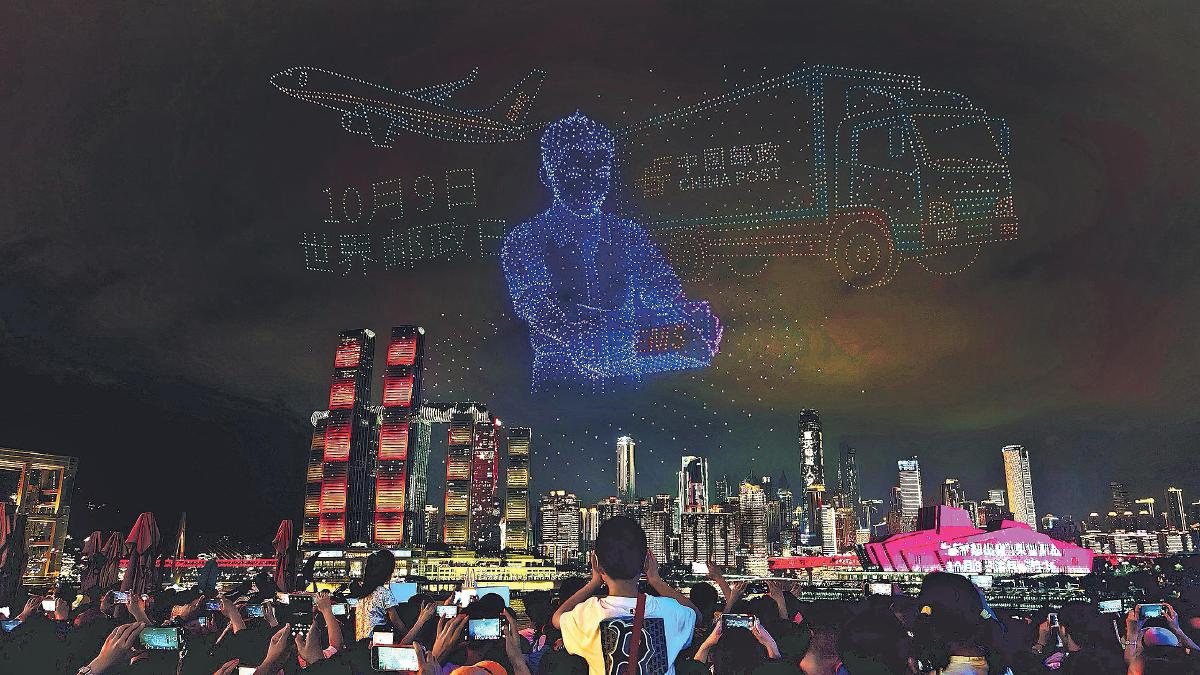10月4日20时30分,重庆市南滨路上空,一场以第56届世界邮政日为主题的无人机灯光秀璀璨上演。数千架无人机以天为幕,在长江上空编织出邮递员风雨无阻、使命必达,邮政金融员工温馨服务、连接美好以及重庆地标明信片诠释山河情谊的影像。现场,来自全国各地的游客及重庆市民驻足观看,纷纷用手机拍下这精彩瞬间。孩子们指着天空欢呼:“看,天上有邮递员在飞!”这场科技与温情交融的视觉盛宴,展现了中国邮政的现代化形象,让群众在节日的欢乐中感受到邮政服务的温度与坚守。
