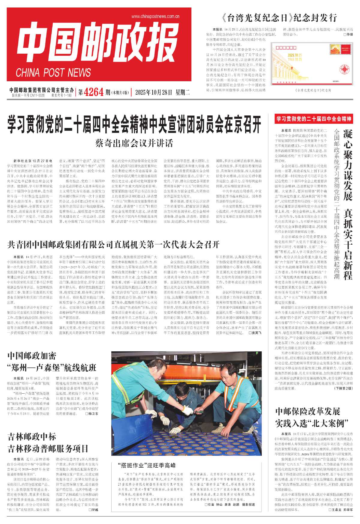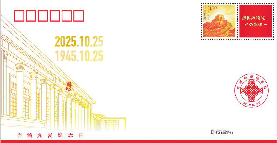 本报讯 10月25日,《台湾光复纪念日》纪念封发行。该纪念封由中共中央台湾工作办公室监制,中国集邮有限公司发行,贴《长城》个性化服务专用邮票,印纪念戳。