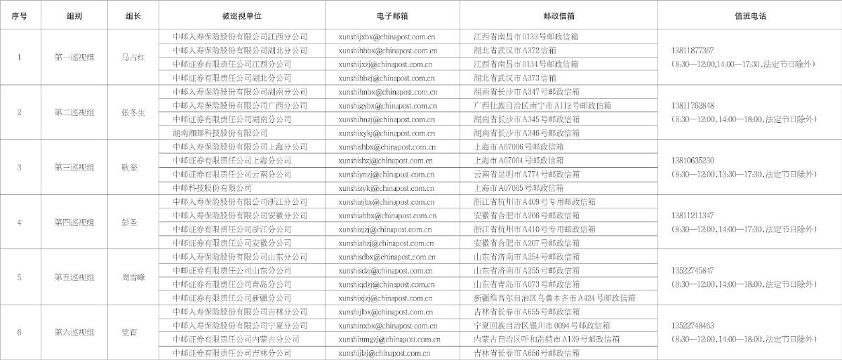 中国邮政集团有限公司党组2025年第二批巡视进驻信息一览表