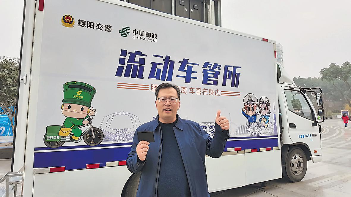 12月2日,四川省德阳市邮政分公司与交警部门联合打造的全市首台警邮流动服务车在文庙广场正式亮相。该车辆配备全流程“车驾管”业务设备与高速网络,可实现驾驶证补换等业务现场受理、体检、制证“一站式”办结,让群众即来即办、立等可取。下一步,德阳警邮双方将推动“流动车管所”常态化下乡进村,让农村和偏远地区居民在家门口即可享受高效、便捷的“车驾管”服务,切实打通服务群众的“最后一公里”。□周玲 摄影报道