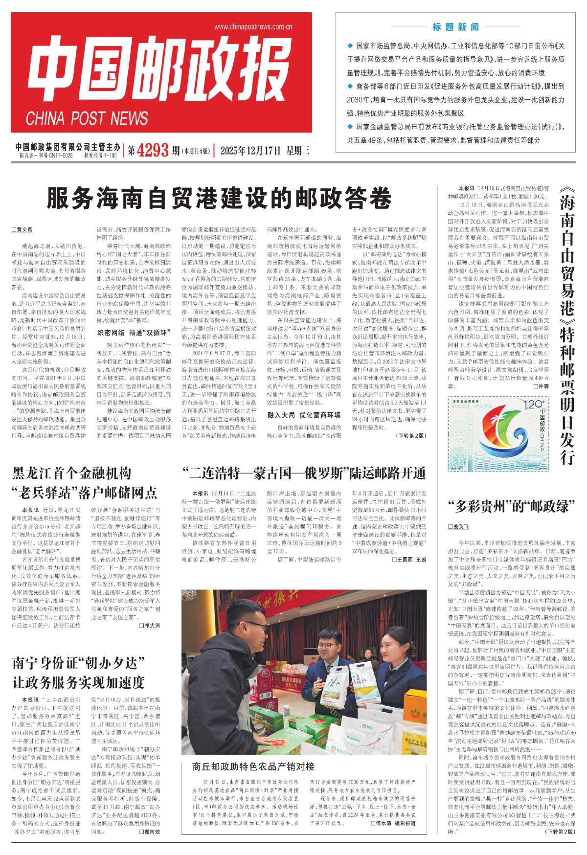 乘着时代大潮,海南邮政始终心怀“国之大者”,牢牢抓住新时代的历史机遇,在物流枢纽建设、营商环境优化、消费中心赋能、城乡服务升级等领域精准发力,充分发挥新时代邮政的战略性基础支撑保障作用、关键性的行业兜底保障作用,用坚实的邮政力量为自贸港封关运作筑牢支撑,绘就壮美“邮”新篇。