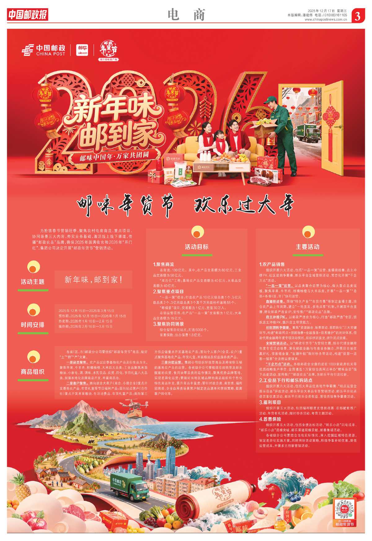 为抢抓春节营销旺季,聚焦农村电商商流、重点项目、协同场景三大内容,夯实业务基础,激活线上线下渠道,传播“邮政农品”品牌,确保2025年圆满收官和2026年“开门红”,集团公司决定开展“邮政年货节”营销活动。