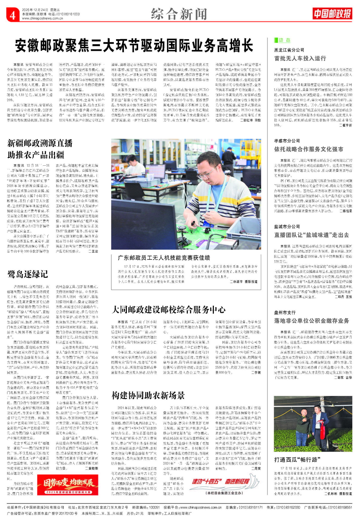 在服务支撑方面,安徽邮政聚焦地方特色产业物流需求,创新推出“服装专线”等定制化产品,为相关企业提供更具针对性的寄递解决方案;加快当地运能资源整合开发,成功打造“江海联运”新通道,进一步优化国际物流运输网络;强化信息系统技术支撑,提升订单处理、物流追踪等全流程响应速度,持续改善客户用邮体验,以高品质服务赢得市场认可。