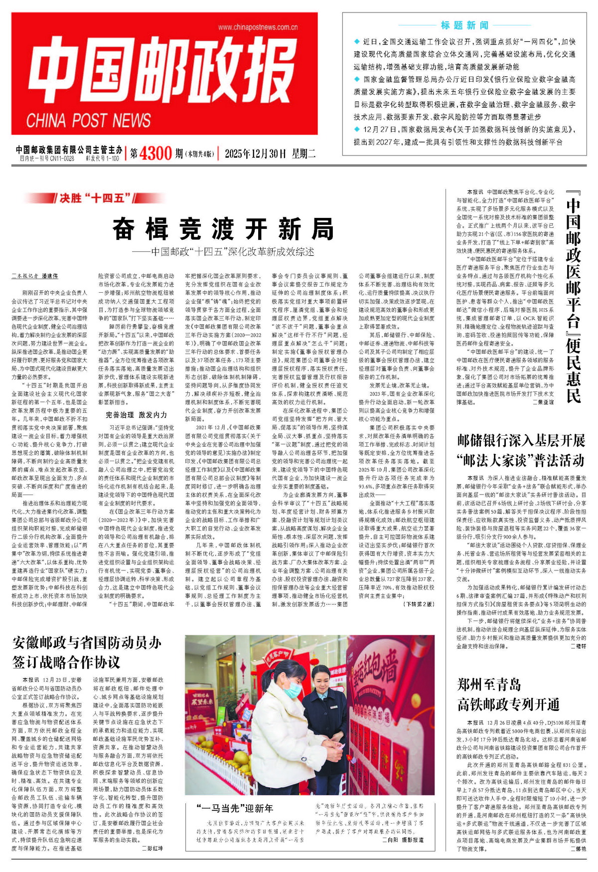 “深化国企改革”,从党的二十届四中全会审议通过的“十五五”规划建议到中央经济工作会议,再到中央企业负责人会议,这一要求一以贯之,道出了国有企业高质量发展的关键命题。“完善中国特色现代企业制度”“健全公司治理结构”,这些聚焦企业发展深层次问题的改革举措,每一项都凝聚着攻坚克难的坚定、久久为功的坚守、锐意进取的坚持。迈向“十五五”的号角已经吹响,中国邮政将充分认识中央企业肩负的职责使命,奋楫笃行,一往无前,聚焦主责主业,以更大魄力涉险滩过难关,开拓创新谋发展,切实增强核心功能、提升核心竞争力,构筑发展新高地新优势,为中国式现代化建设贡献更大力量。