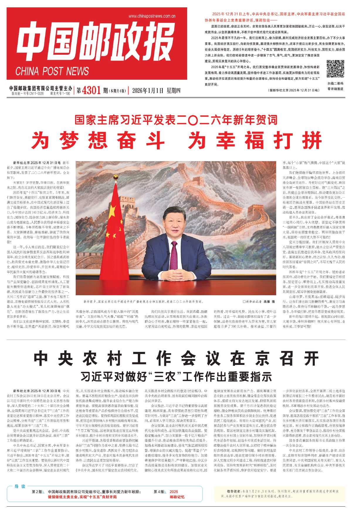 2026年是“十五五”开局之年。锐始者必图其终,成功者先计于始。我们要锚定目标任务,坚定信心、乘势而上,扎实推动高质量发展,进一步全面深化改革开放,推进全体人民共同富裕,续写中国奇迹新篇章。