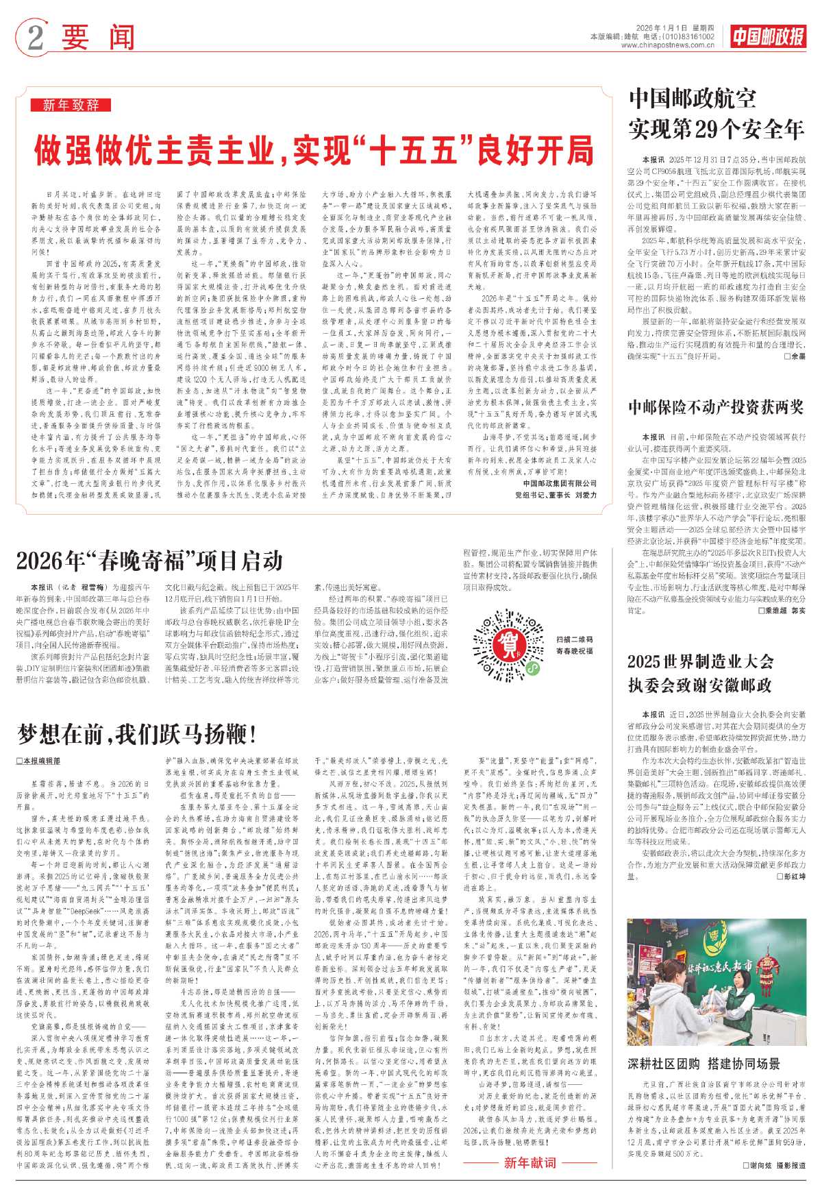 信仰如旗,指引前程;信念如磐,凝聚力量。现代化新征程从非坦途,但心有所向,何惧路长。以信心坚定信心,用希望点亮希望。新的一年,中国式现代化的邮政篇章落笔新的一页,“一流企业”的梦想在你我心中升腾。带着实现“十五五”良好开局的期盼,我们将紧随企业的铿锵步伐,永葆人民情怀,凝聚邮人力量,唱响激昂之歌,把伟大的精神讲鲜活,把巨变的历程讲精彩,让党的主张成为时代的最强音,让邮人的不懈奋斗成为企业的主旋律,触抵人心开出花,激荡起生生不息的动人回响!