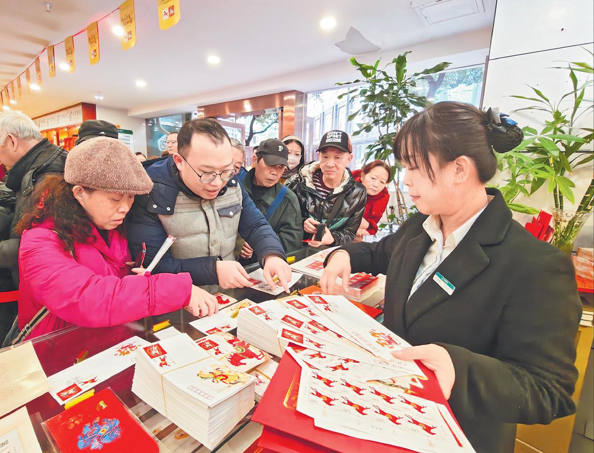 1月5日,《丙午年》特种邮票全国发行,以“驰跃宏图、万骏臻福”的文化意象,将传统生肖底蕴与时代活力传遍全国。各地邮政营业网点联动构建生肖文化传播矩阵,让这套承载奋进寓意与吉祥期许的“国家名片”,成为“十五五”开局之际的全国性文化热点。老邮迷品鉴方寸匠心,年轻人追捧文创潮流,掀起全民集藏热潮。图为贵州省贵阳市喷水池邮政营业所工作人员热情地向市民讲解马年生肖邮票的设计理念与印制特色。此外,该营业所还特别准备了开阳马场生肖原地戳等特色纪念邮戳,切实满足广大邮迷需求。 □韩静桦 摄影报道
