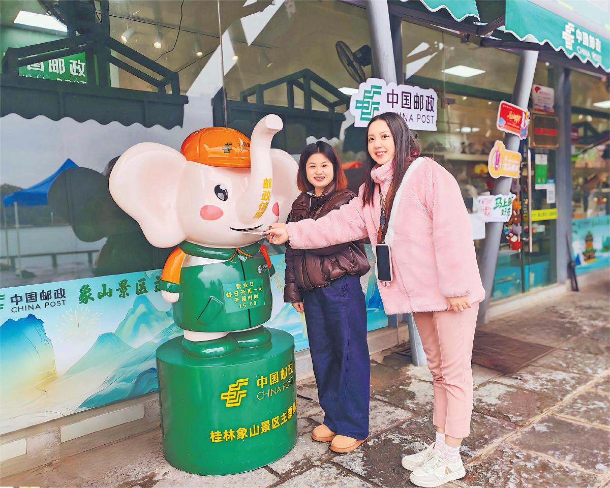 广西壮族自治区桂林市邮政分公司在象山景区主题邮局举办首发活动,免费为市民、游客提供生肖纪念戳加盖服务。图为游客将盖好戳的明信片投入邮筒寄出。