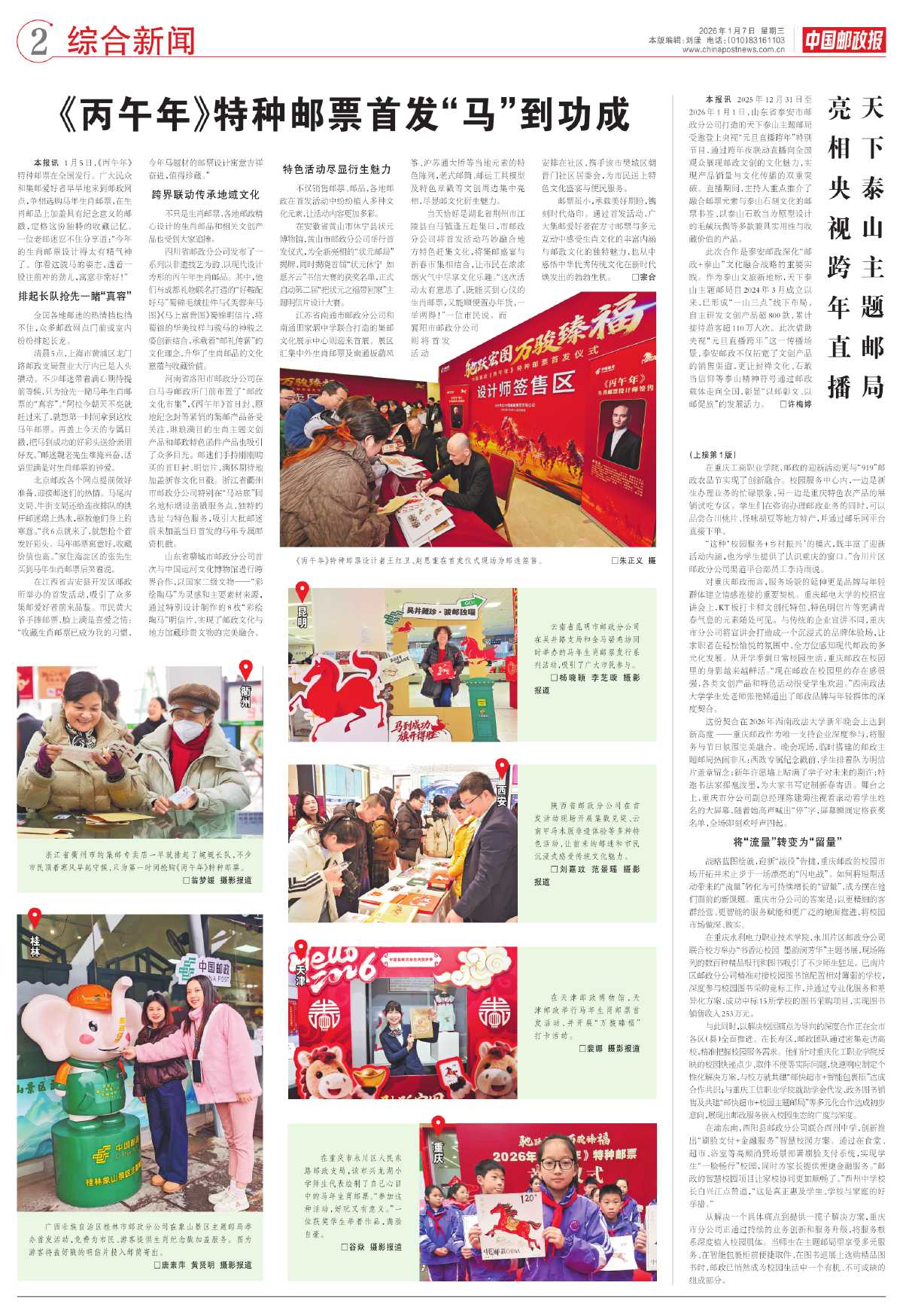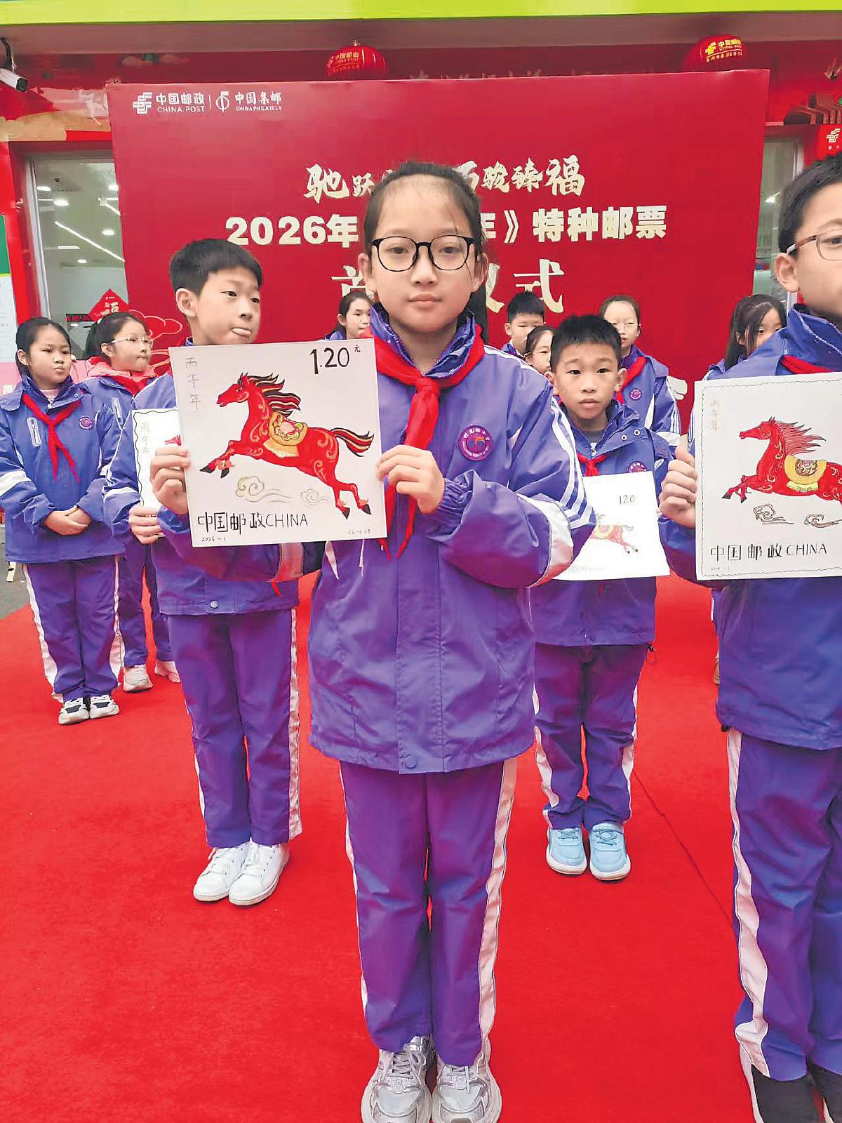 本报讯 1月5日,《丙午年》特种邮票在全国发行。广大民众和集邮爱好者早早地来到邮政网点,争相选购马年生肖邮票,在生肖邮品上加盖具有纪念意义的邮戳,定格这份独特的收藏记忆。一位老邮迷忍不住分享道:“今年的生肖邮票设计得太有精气神了。你看这骏马的姿态,透着一股往前冲的劲儿,寓意非常好!”