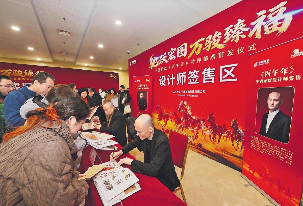 《丙午年》特种邮票设计者王红卫、赵恩重在首发仪式现场为邮迷签售。 □朱正义 摄