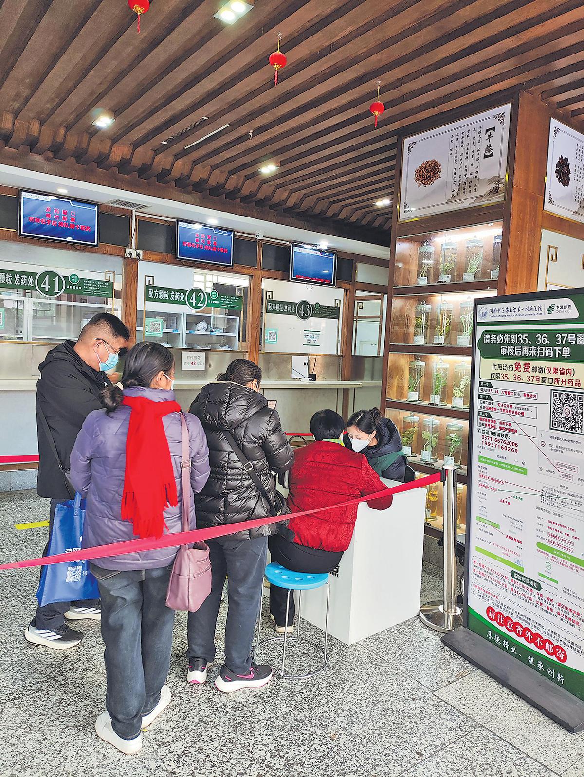 在河南省中医一附院,邮政工作人员为就诊患者提供寄付下单指引服务。