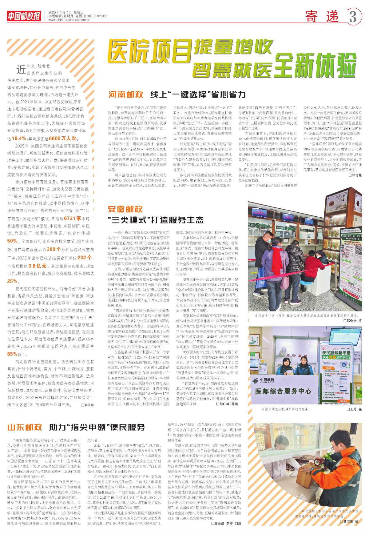 2025年,“医邮联动”项目日均服务群众近2000人次,累计惠及患者近30万人次。为进一步提升服务价值,河南邮政拟持续拓展便民场景,针对急诊患者的紧急需求,专门开通“2小时急送”绿色通道服务;联合医院新增“体检报告EMS代寄”服务,让群众无须到院即可安全收取报告,进一步完善“不见面就医”服务链条。