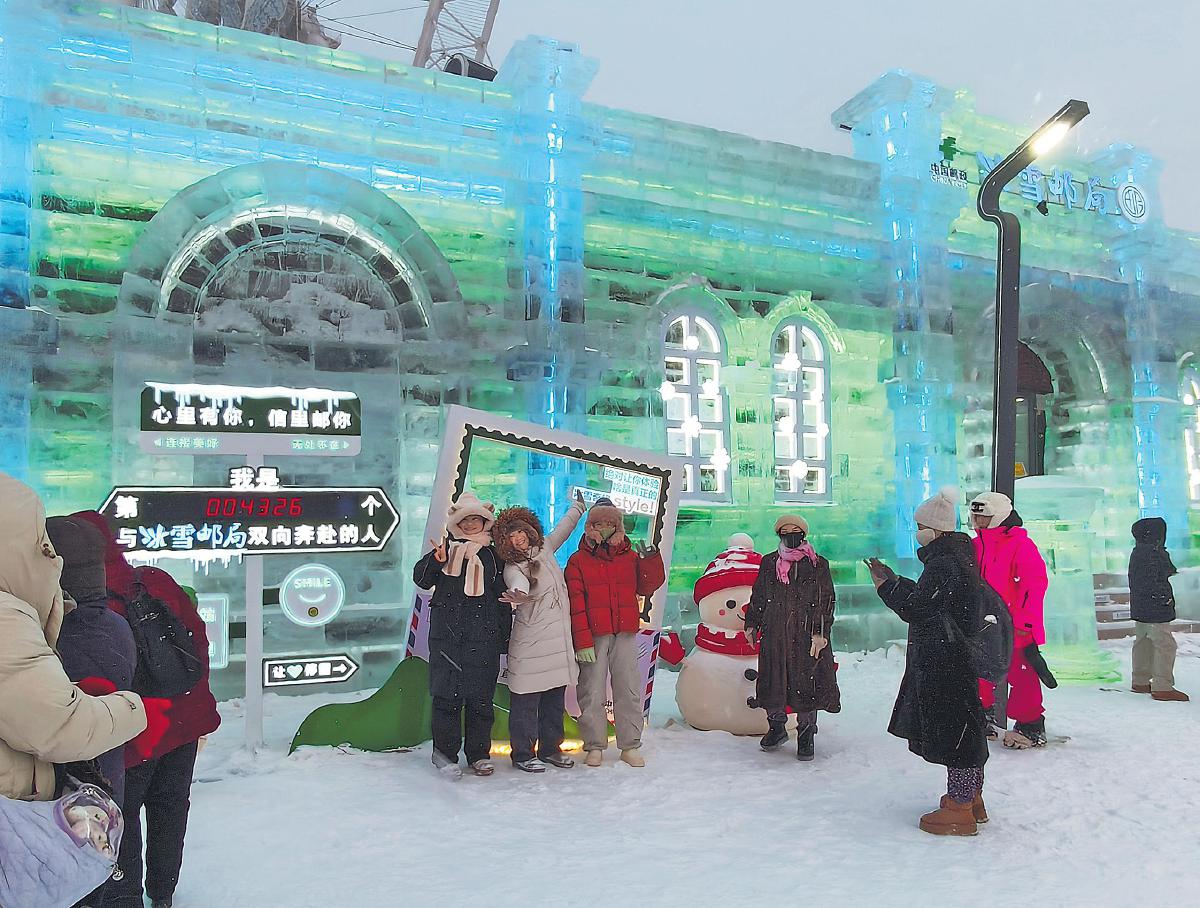 自第二十七届哈尔滨冰雪大世界开园至今,冰雪邮局日均接待游客近5000人,元旦假期每天接待游客超万人。今年的冰雪邮局迁移至园区内地标性建筑——“雪花摩天轮”之下,采用“暖屋+冰灯包裹”的建筑设计。冰雪邮局推出的近300种涵盖地方风光与冰雪文化的封片及文创产品受到游客欢迎,门口的冰雕邮筒、雪娃娃和明信片留影框也吸引了众多游客驻足打卡。 □张丹丹 王旭 摄影报道