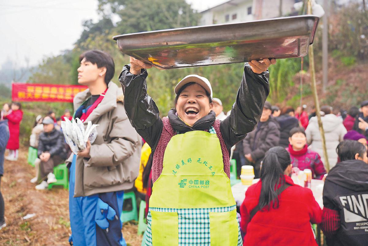 宴席将散,服务未止。村口公路旁,邮政的临时收寄点前排起了队。村民把自家的腊货、柑橘摆出来,邮政的绿色包装箱、胶带、面单一应俱全。“买了50斤橘子,交给邮政寄回去。”从四川来的游客李先生说。