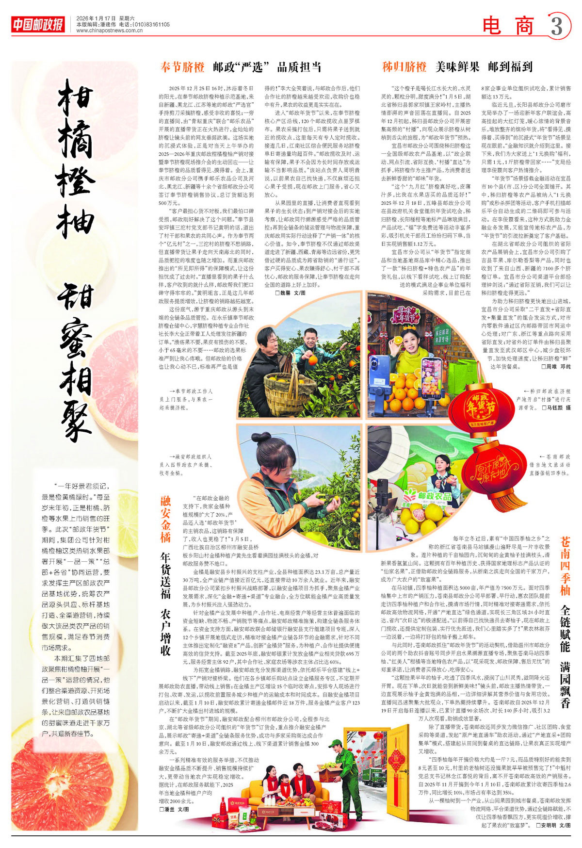 与此同时,苍南邮政抓住“邮政年货节”的活动契机,借助温州市邮政分公司的两个助农抖音账号同步开启水果溯源直播专场,聚焦苍南马站四季柚、“红美人”柑橘等当地特色农产品,以“现采现发、邮政保障、售后无忧”的郑重承诺,让消费者买得放心、吃得安心。