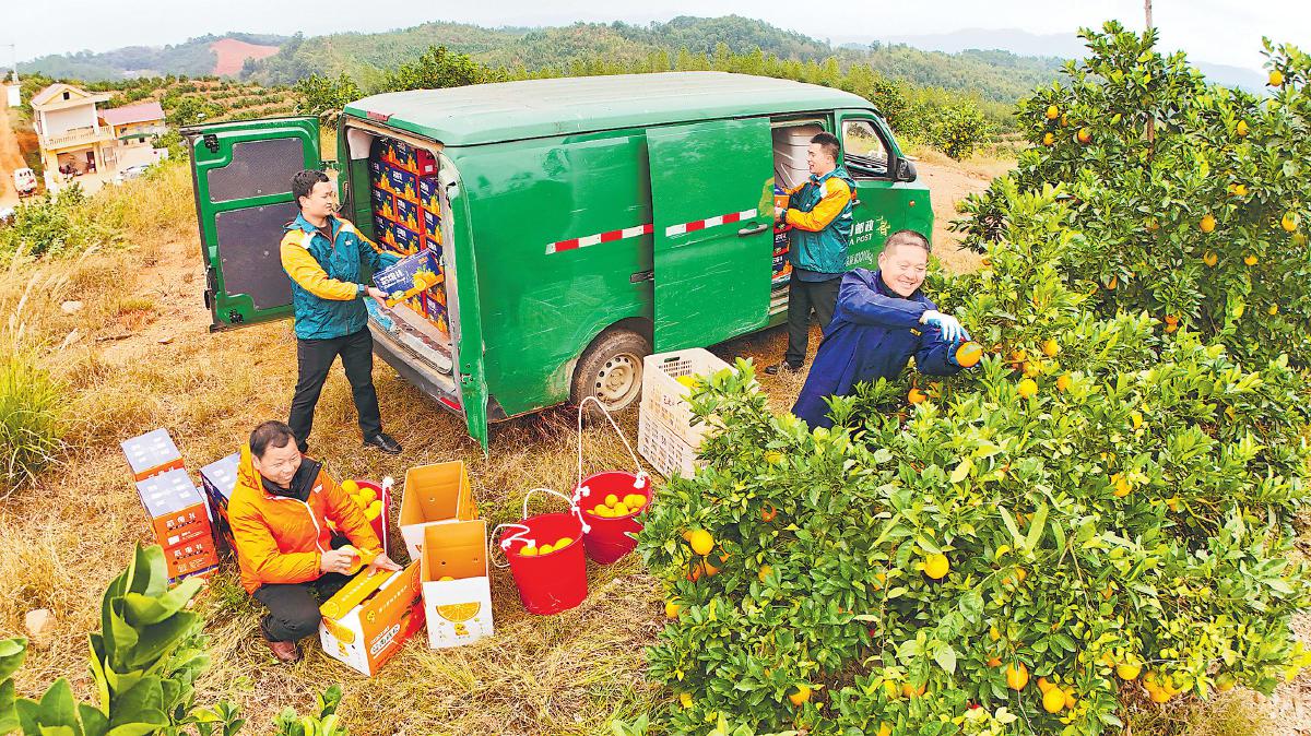 近年来,江西邮政运用“两法”持续深耕柑橘橙柚寄递市场,组建专项营销团队深入田间地头、水果批销市场,实施网格化营销。全省各地邮政积极为果农提供上门收寄服务,开辟绿色通道并通过“县城+村镇+果园”三级联动模式,确保邮件当日收寄、当日发运,助力赣南脐橙从枝头新鲜直达全国消费者的餐桌。图为吉安市泰和县邮政分公司员工在当地脐橙基地帮助果农采摘、装箱。