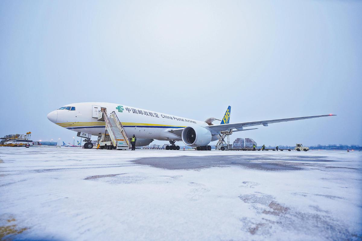 1月19日上午,河南郑州新郑国际机场的飘雪裹着寒意,一架郑州至卢森堡的邮航全货机停靠在机坪。邮航地勤人员穿梭其间,将一板板邮货稳稳装入机舱——这架身披邮政标识的飞机即将带着风雪里的牵挂与年货,沿着国际邮路奔赴远方,成为新春里跨越山海的温暖联结。 □李平 摄