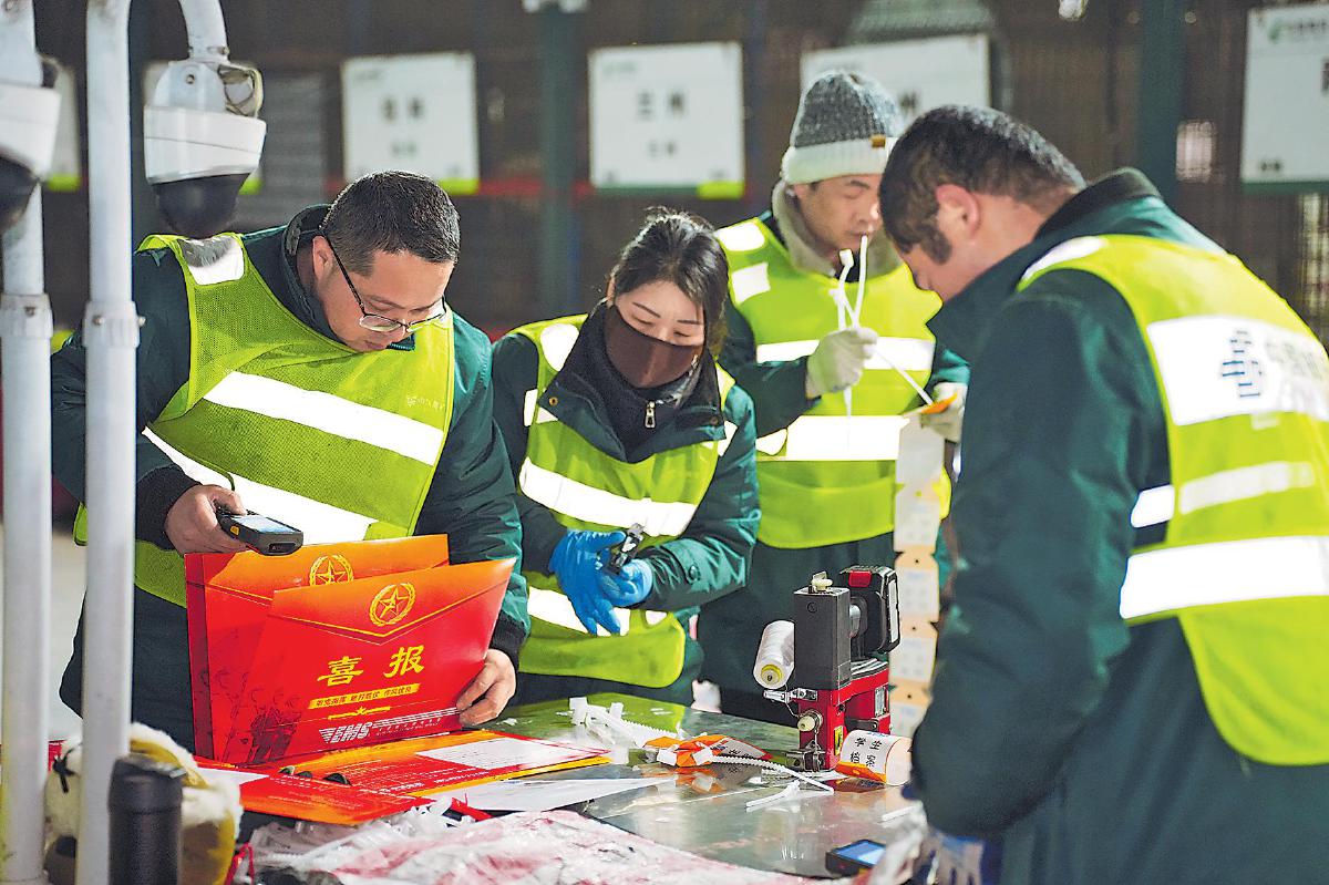 1月18日21时,郑州邮区中心航空邮件处理中心灯火通明,邮政工作人员忙着将“军人喜报”等EMS邮件进行扫描、分拣与封发。 □李平 摄