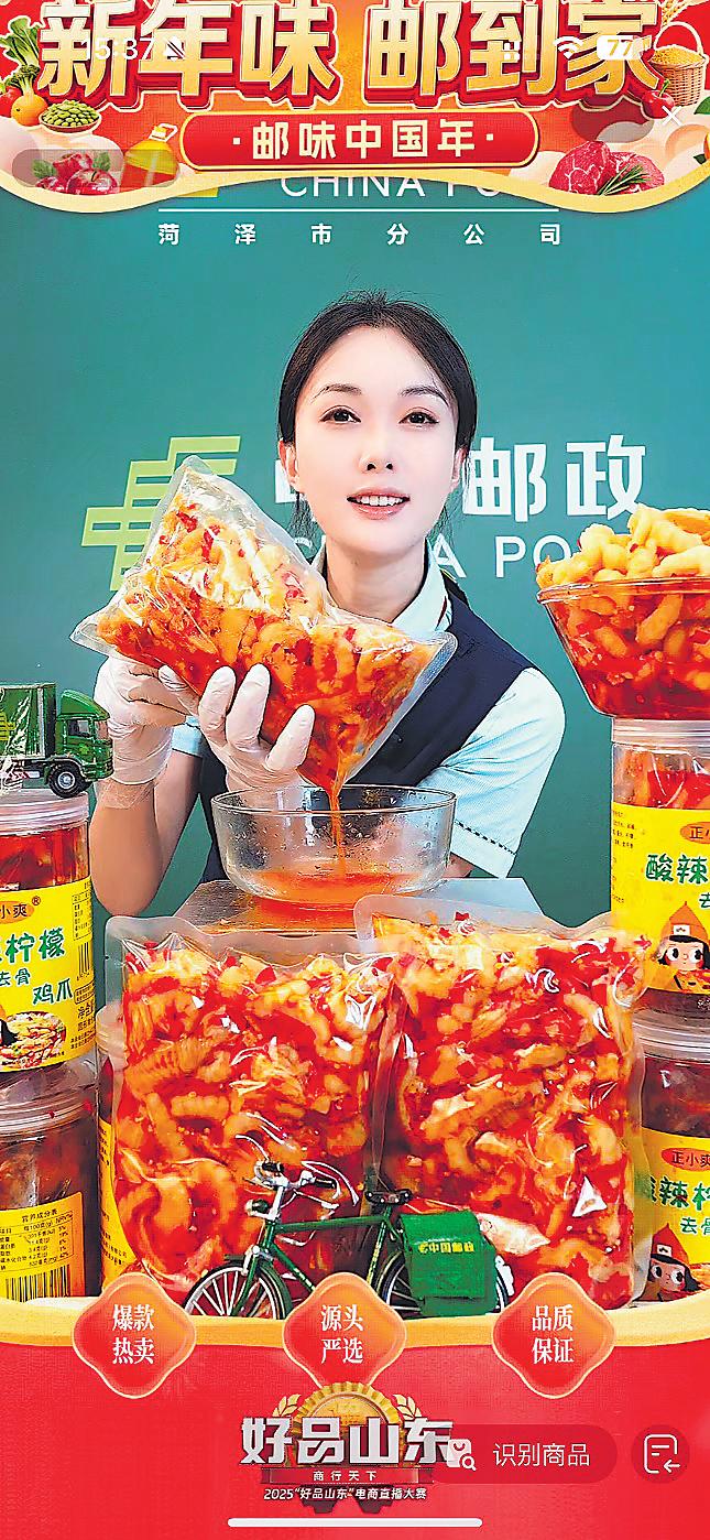 “‘年货节’福利来了!无骨鸡爪酸辣开胃,佤味鸡爪麻辣鲜香,为春节家宴增添美味!”在菏泽邮政“年货节”主题直播间,主播的热情推荐迅速激发消费意愿,让这场精心筹备的年货直播一炮而红。