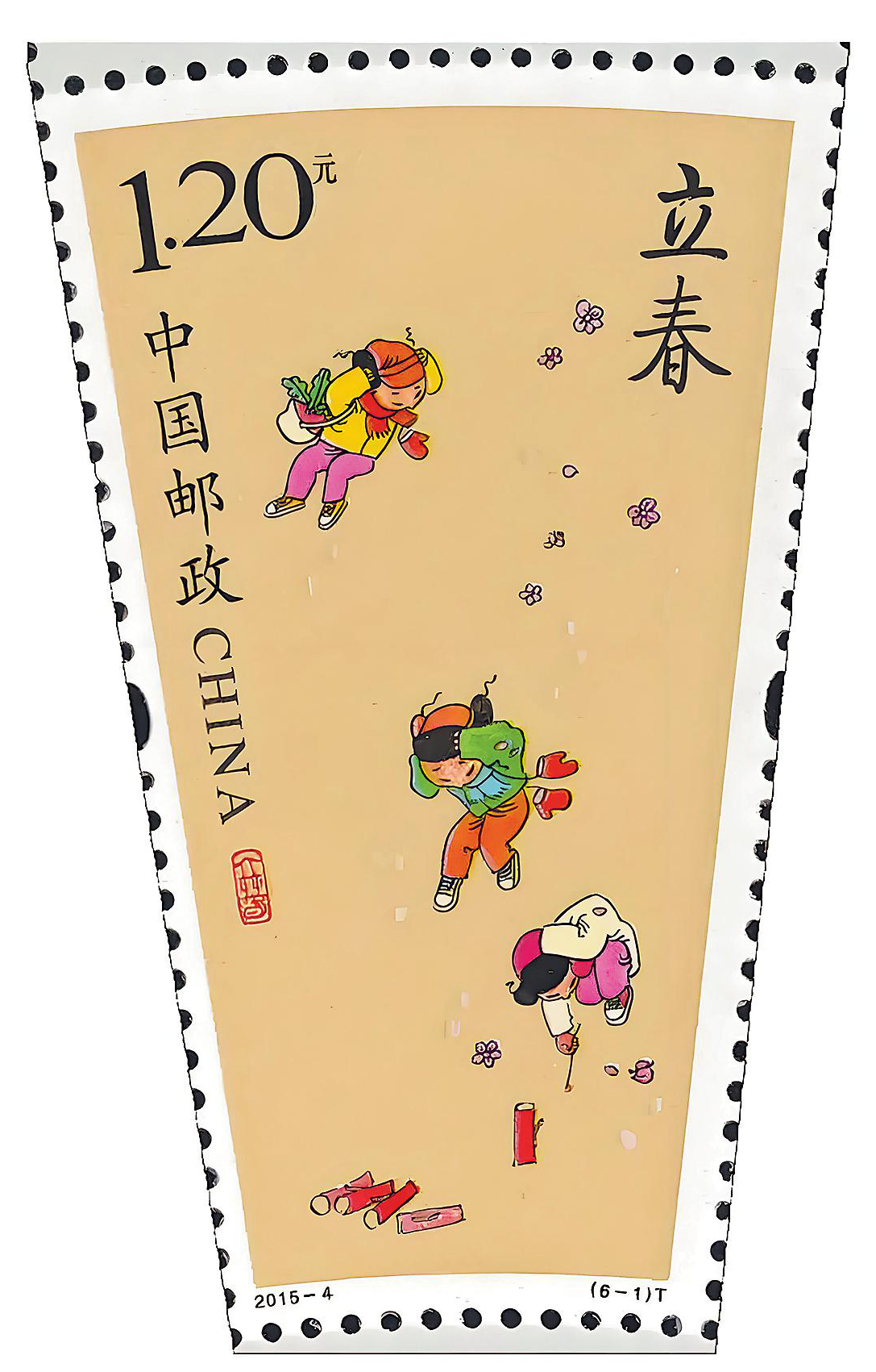从2015年2月4日至2019年11月8日,中国邮政共发行二十四节气系列邮票四套,每套6枚,合计24枚。这个系列的邮票,以不同的节气为名,从立春开始到大寒结束,图案均为相应节气的物候、民俗、农事等,一方面体现了季节轮转中各个节气的变化,另一方面也反映了几千年来中华民族生生不息传承下来的智慧、文化与思想,兼具科学性和趣味性。