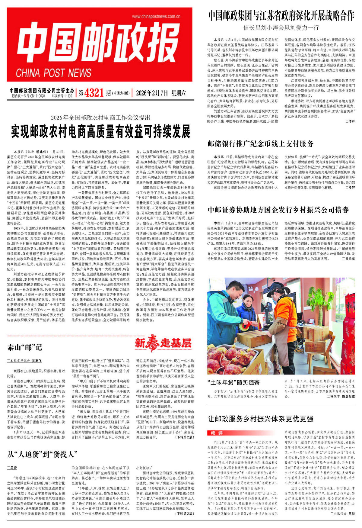 开往泰山中天门的旅游巴士轰鸣,搅动着清晨寒气。宽敞明亮的车厢里,欢声笑语此起彼伏。游客们戴着红围巾相谈甚欢,对五岳之巅翘首以盼。人群中,身着绿色邮政标志服的宋现生和王晓伟分外显眼。“春节快到了,又赶上周末,今天来登山祈福的人比平时更多了。大巴车人满就往山上发车,间隔很短。”宋现生看了看车厢,又望了望窗外徒步的游客,笑着告诉记者。