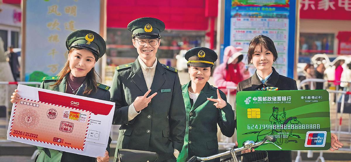 巡游队伍抵达终点沙隆达广场后,一处以马年新春为主题设计的临时邮局迅速成为全场人气最旺的区域之一。邮局前的新年打卡墙巧妙融入生肖元素与邮政标志,吸引年轻人排起长队拍照留念。不少游客现场选购明信片,盖上当日纪念戳,认真写下祝福语后投入临时信箱。“从外地回荆州过年,正好寄张明信片给大学同学,盖上本地邮戳特别有意义。”家住沙市区滨湖国际小区的返乡“00后”张先生笑着说。