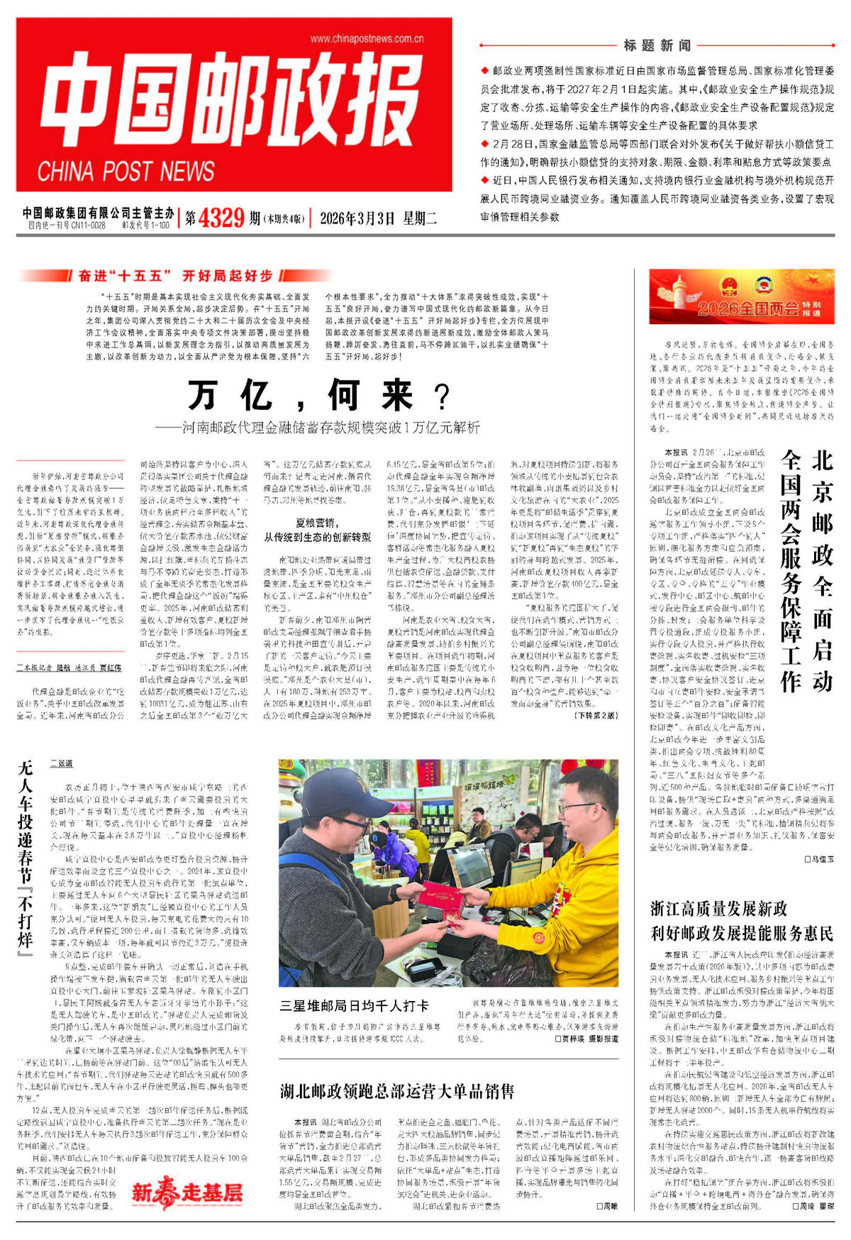 “十五五”时期是基本实现社会主义现代化夯实基础、全面发力的关键时期。开局关系全局,起步决定后势。在“十五五”开局之年,集团公司深入贯彻党的二十大和二十届历次全会及中央经济工作会议精神,全面落实中央专项文件决策部署,提出坚持稳中求进工作总基调,以新发展理念为指引,以推动高质量发展为主题,以改革创新为动力,以全面从严治党为根本保障,坚持“六个根本性要求”,全力推动“十大体系”取得突破性成效,实现“十五五”良好开局,奋力谱写中国式现代化的邮政新篇章。从今日起,本报开设《奋进“十五五”开好局起好步》专栏,全方位展现中国邮政改革创新发展取得的新进展新成效,激励全体邮政人策马扬鞭、踔厉奋发、勇往直前,马不停蹄加油干,以扎实业绩确保“十五五”开好局、起好步!