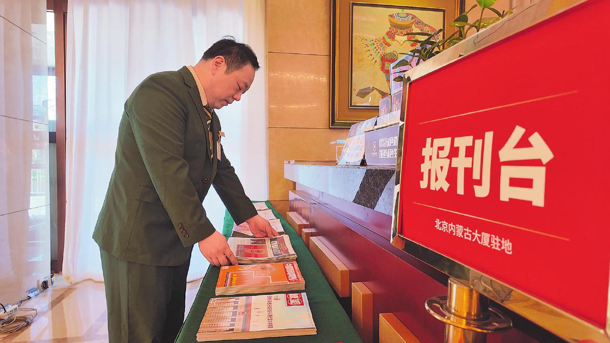 3月6日,邮政工作人员在两会驻地报刊台精心整理党报党刊,以高效服务及时传递两会声音。