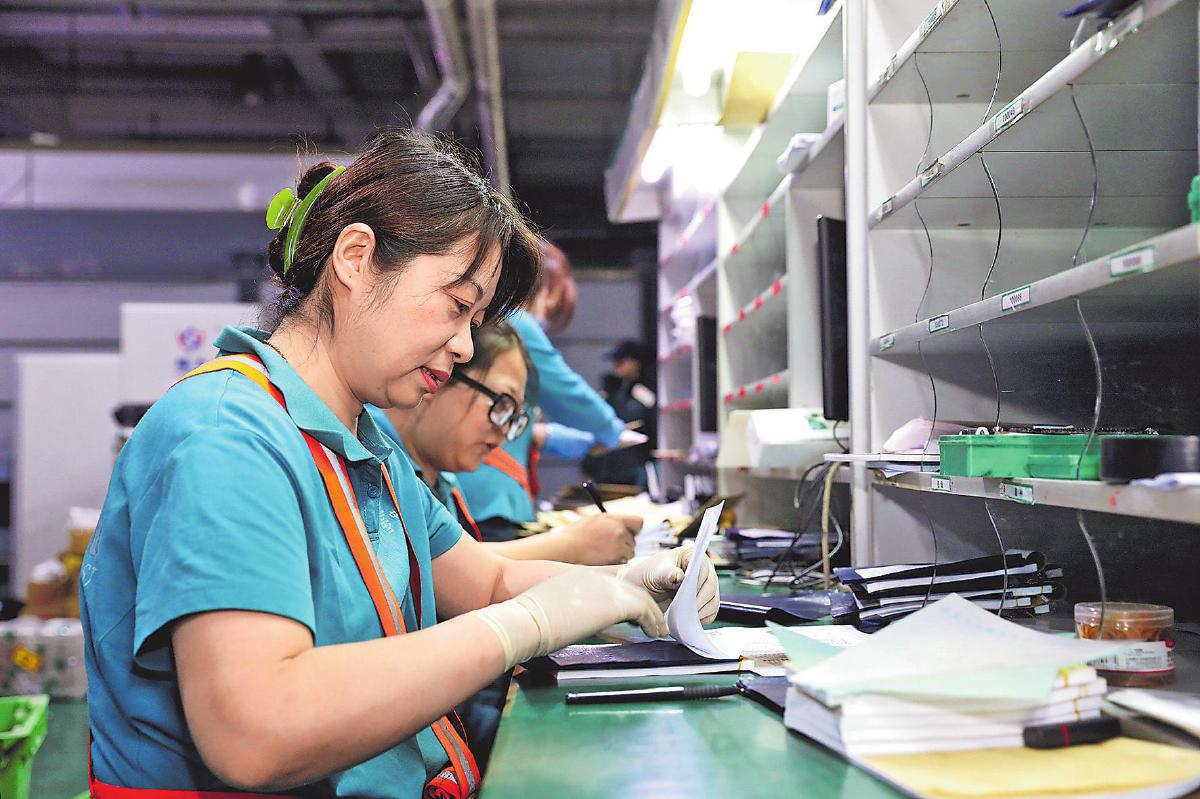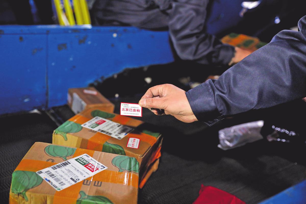 下图:3月2日,北京邮政工作人员为快件粘贴“北京已安检”标识,严格落实寄递安检措施,筑牢全国两会期间寄递渠道安全防线。