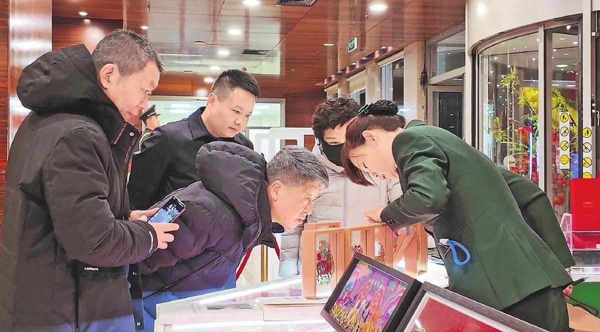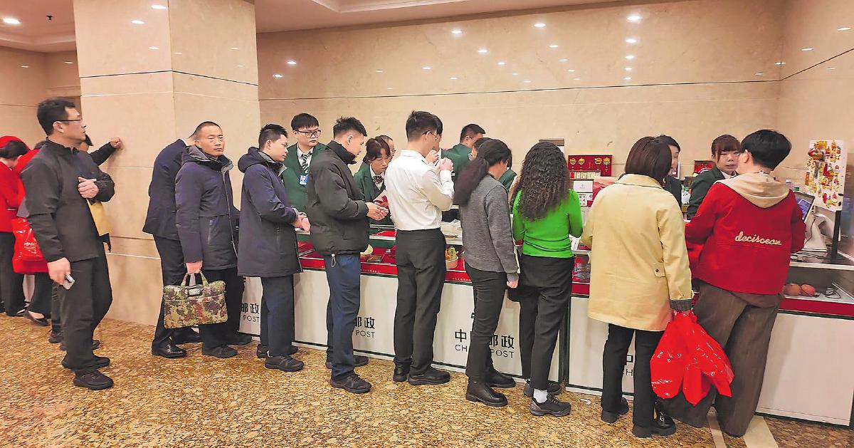 3月5日,两会驻地邮政服务点,邮政工作人员俯身细致讲解特色产品,与会人员驻足凝神,近距离感受邮政文化魅力。