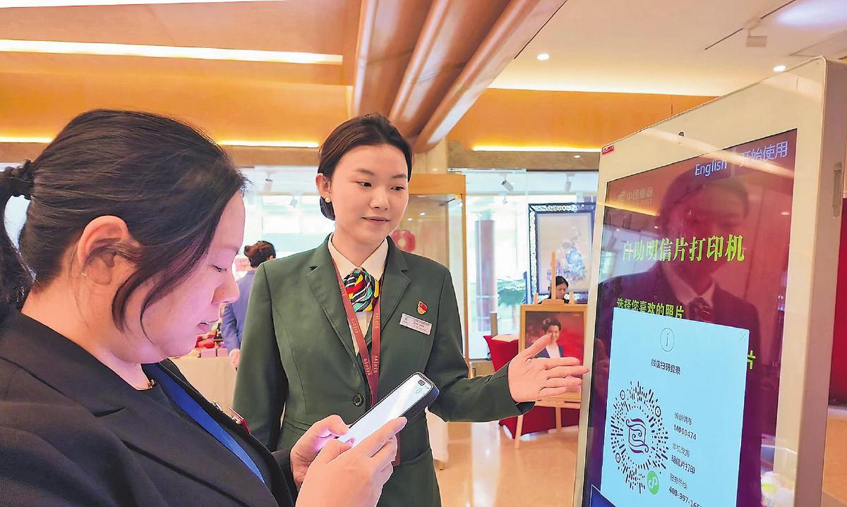 3月6日,两会驻地,邮政工作人员指导与会人员使用自助明信片打印机,将履职瞬间定格为专属纪念。