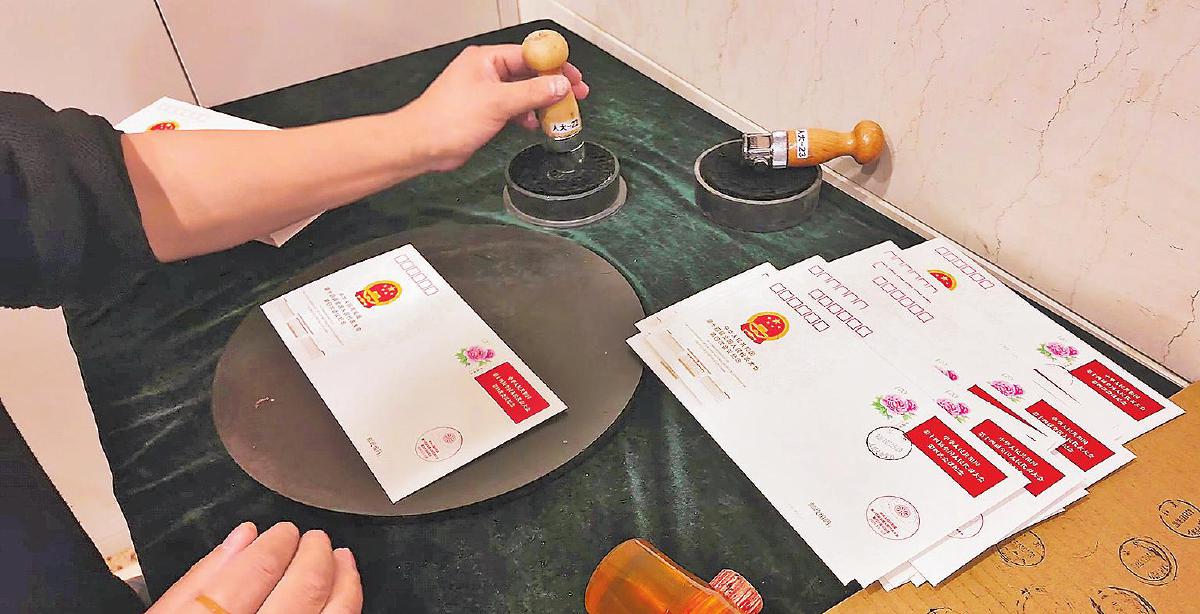 上图:3月5日,邮政工作人员为全国两会纪念封加盖纪念戳。一枚枚纪念封,用邮政语言记录两会时刻。