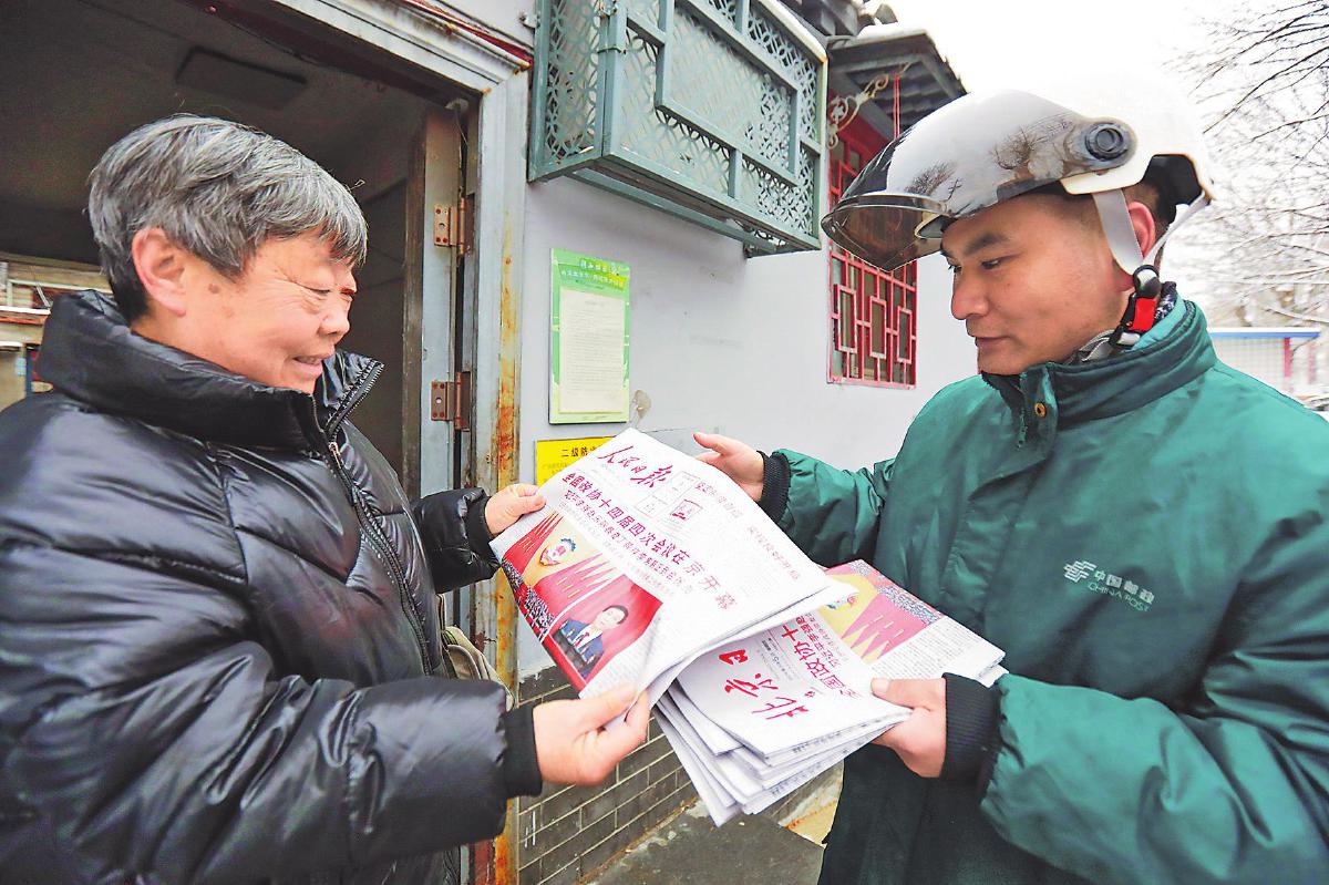 左下图:3月5日9时30分,北京东四邮政支局投递员送达当日《人民日报》。