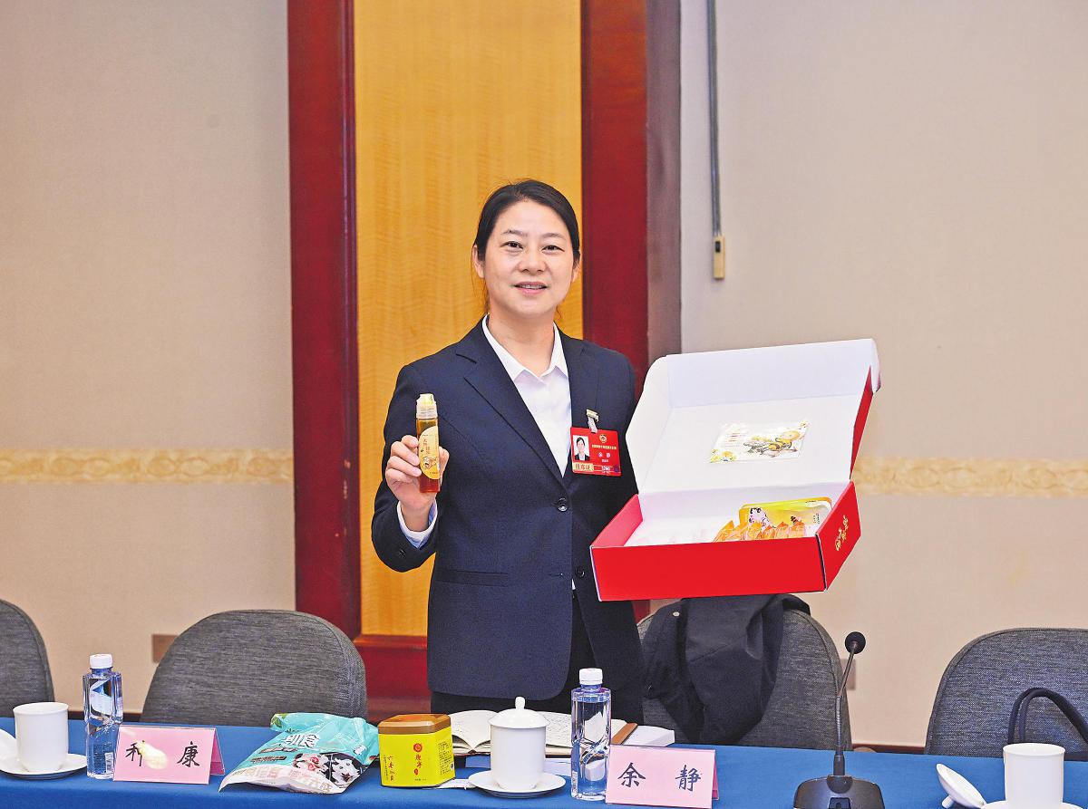 “欢迎大家来大湾!”全国两会期间,全国政协委员、安徽省金寨县大湾村党总支第一书记余静在小组会上举起一份“甜蜜四件套”礼盒,向全国发出邀请。蜂蜜、红薯干、玉木耳、金丝皇菊,外加一枚“幸福邀请函”明信片——这份装满大别山味道的伴手礼,迅速出圈。