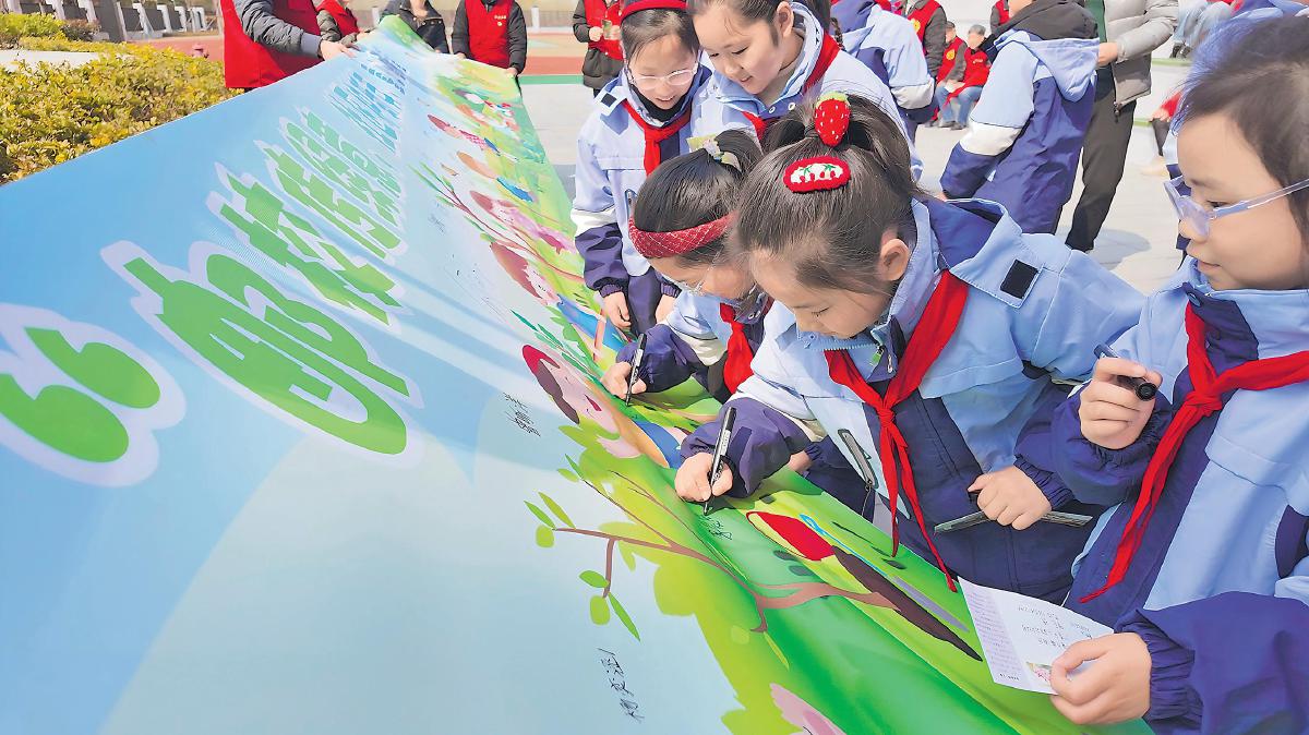 江苏省南通市海门区邮政分公司联合海门街道城北社区、张謇小学开展“邮校传绿意 社区护新芽 童心植希望”主题实践活动。活动现场,孩子们齐声宣读“爱绿护绿”倡议书,联手绘制8米长“绿色画卷”,以稚嫩笔触勾勒青山绿水、鸟语花香的生态图景,随后投出“美丽海门”明信片,将绿色寄语寄往未来。 □王欢 摄影报道