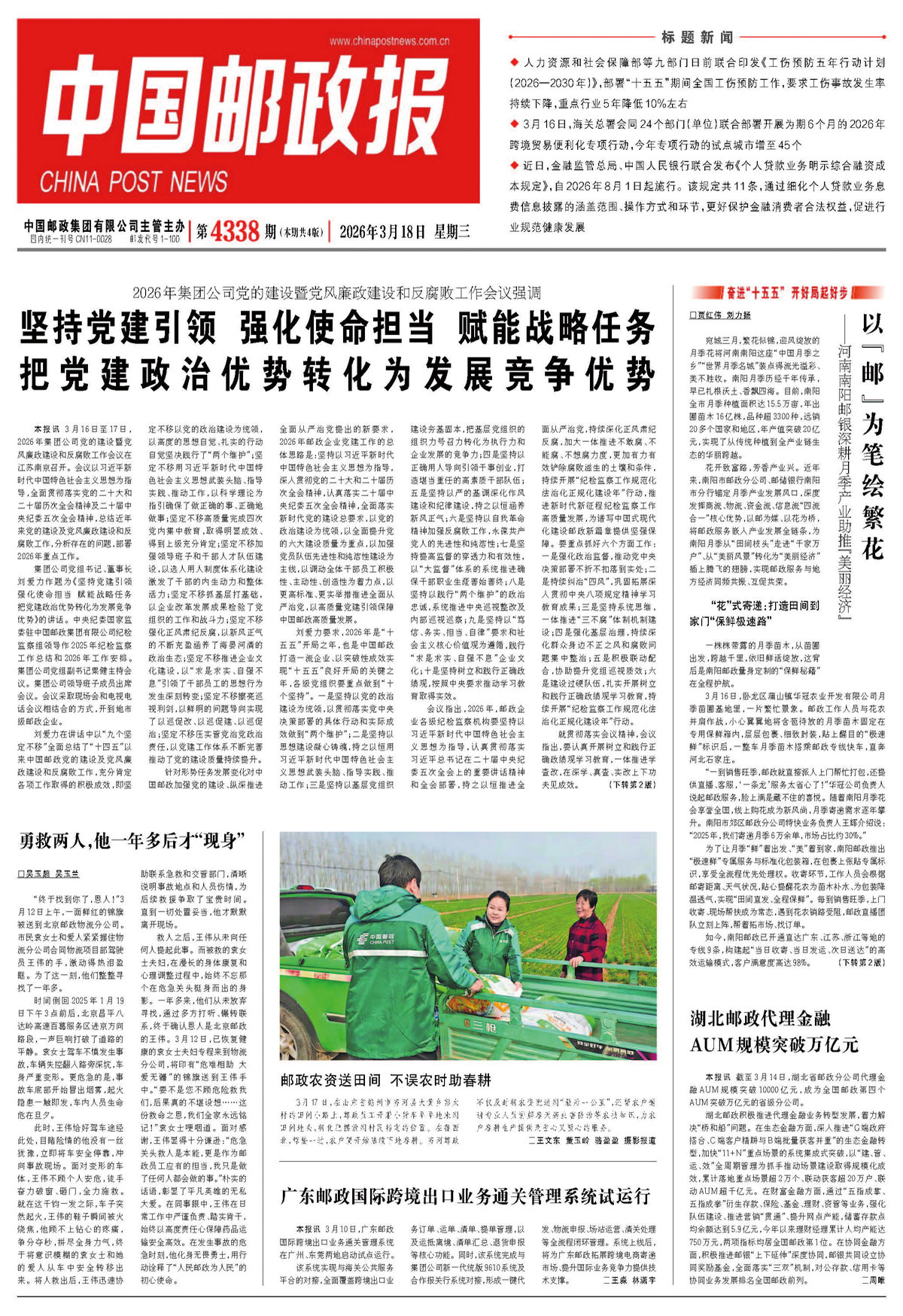 刘爱力要求,2026年是“十五五”开局之年,也是中国邮政打造一流企业、以突破性成效实现“十五五”良好开局的关键之年,各级党组织要重点做到“十个坚持”。一是坚持以党的政治建设为统领,以贯彻落实党中央决策部署的具体行动和实际成效做到“两个维护”;二是坚持以思想建设凝心铸魂,持之以恒用习近平新时代中国特色社会主义思想武装头脑、指导实践、推动工作;三是坚持以基层党组织建设夯基固本,把基层党组织的组织力号召力转化为执行力和企业发展的竞争力;四是坚持以正确用人导向引领干事创业,打造堪当重任的高素质干部队伍;五是坚持以严的基调深化作风建设和纪律建设,持之以恒涵养新风正气;六是坚持以自我革命精神加强反腐败工作,永葆共产党人的先进性和纯洁性;七是坚持提高监督的穿透力和有效性,以“大监督”体系的系统推进确保干部职业生涯善始善终;八是坚持以践行“两个维护”的政治忠诚,系统推进中央巡视整改及内部巡视巡察;九是坚持以“笃信、务实、担当、自律”要求和社会主义核心价值观为遵循,践行“求是求实、自强不息”企业文化;十是坚持树立和践行正确政绩观,按照中央要求推动学习教育取得实效。