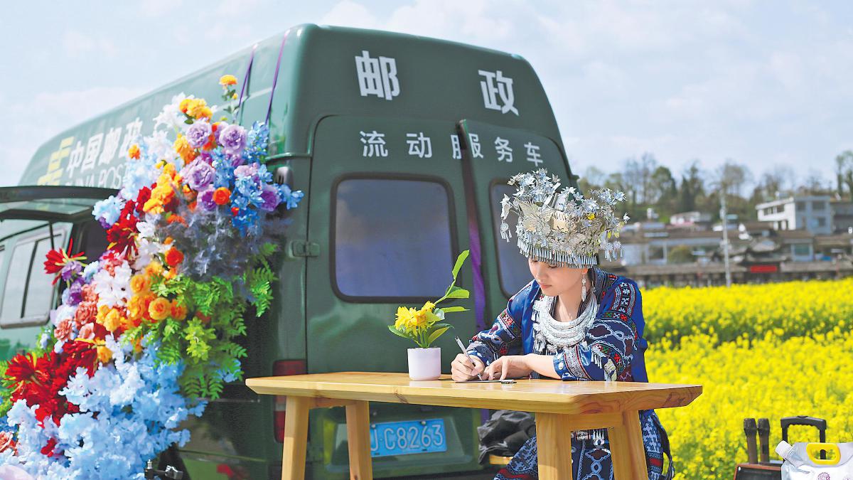 3月21日,贵州省黔南布依族苗族自治州贵定县邮政分公司在金海雪山景区设立的临时主题邮局投入运营,在油菜花海中为游客提供明信片寄递、文创产品选购及拍照打卡等服务。主题邮局现场设有打卡拍照区、文创产品展示区、明信片书写寄递区和助农产品销售区。