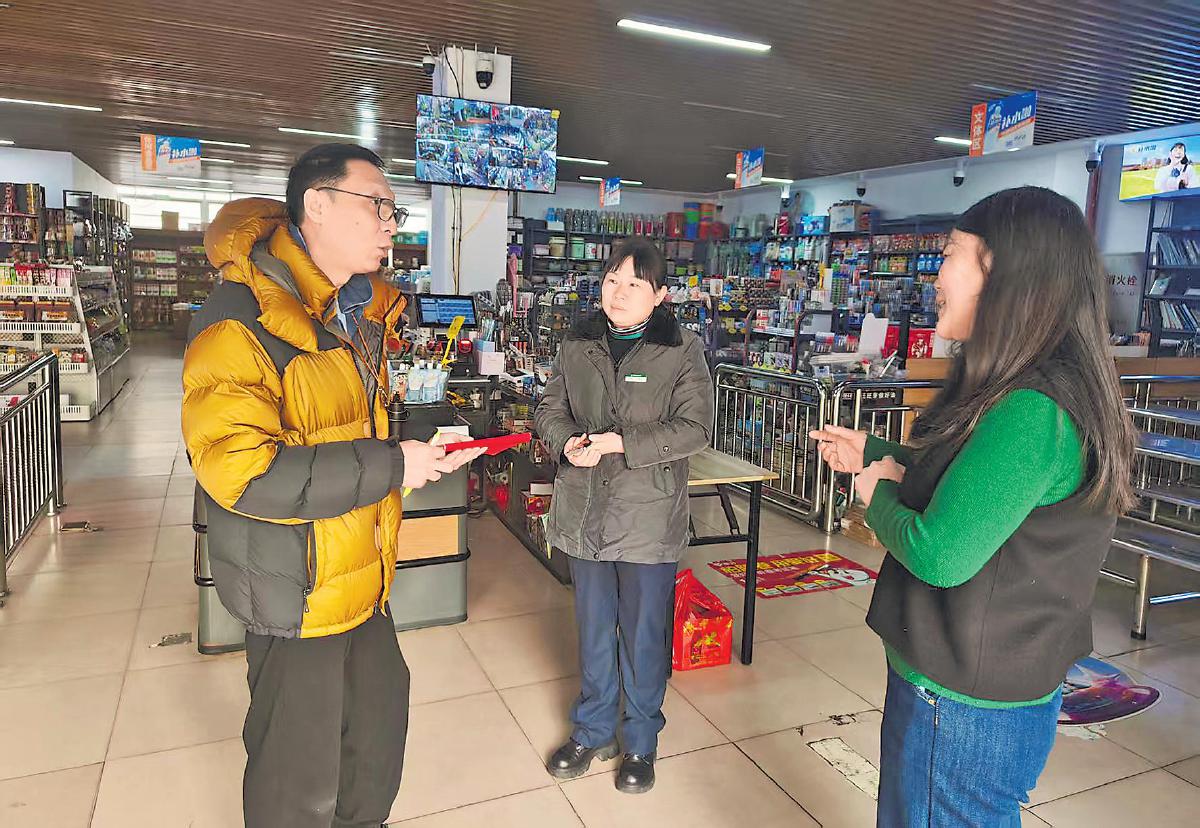 记者(左一)与朱桂华(中)一同走访商超客户。