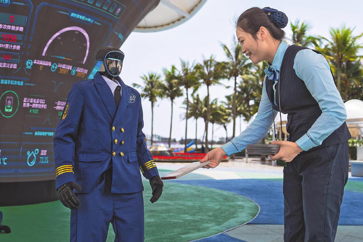 邮政工作人员与服务博鳌年会的智能机器人现场互动。 □陈师 摄