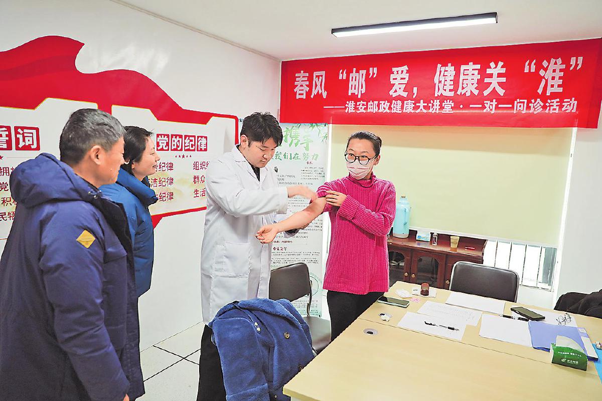 3月16日—20日,江苏省淮安市邮政分公司在寄递揽投部、金融网点等职工之家开展“春风‘邮’爱 健康关‘淮’”健康大讲堂暨一对一问诊活动。活动特邀中医专家现场坐诊,为职工开展体质辨识与健康指导,普及科学保健知识,切实把组织关怀送到一线职工身边。此次活动是该分公司坚持党建引领、践行以人为本理念的务实举措,充分发挥工会服务职工职能,进一步提升了职工的归属感与幸福感。 □赵俊 摄影报道